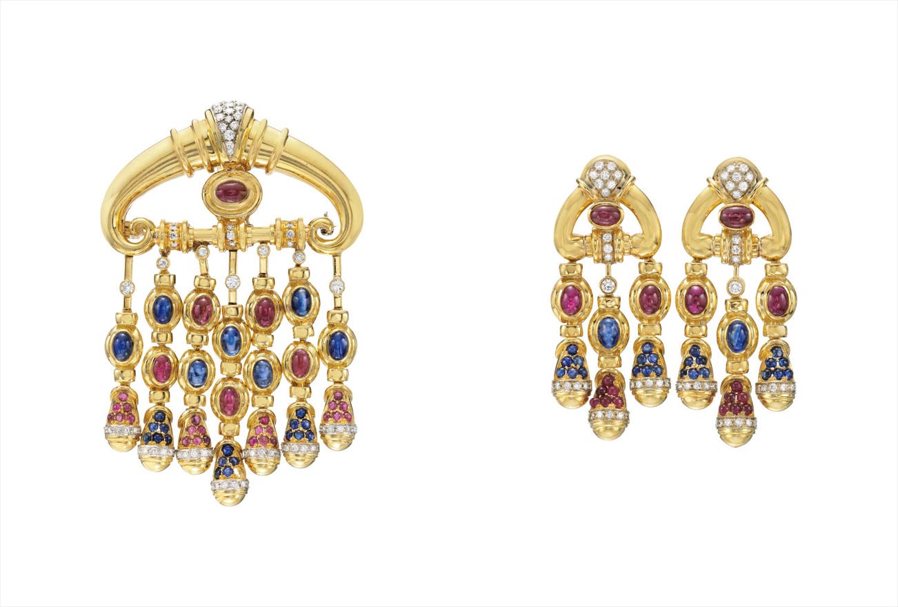 Comprising a brooch designed as a series of polished gold fringe, set with cabochon sapphires, rubies, and circular-cut diamonds, suspended from an arched bombé plaque; a pair of ear pendants en suite, mounted in 18K yellow gold, brooch can also be worn as a pendant, length 3 1/4 inches, ear pendant length 2 inches.