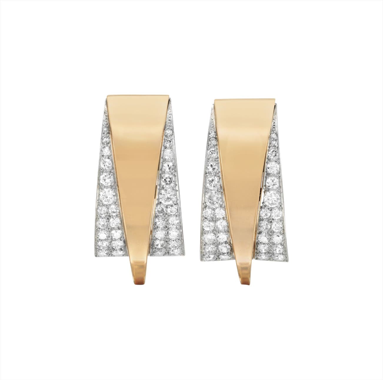 Each of geometric bombé design, the tapered rectangular plaque enhanced by circular-cut diamonds, mounted in 18K rose gold and platinum, length 1 1/2 inches.