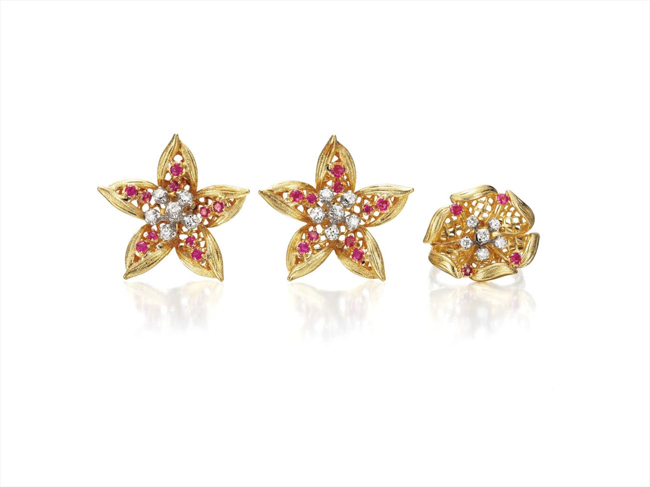 Comprising a pair of earclips, each designed as a textured gold flower enhanced by circular-cut diamonds and rubies; a similarly designed ring en suite, mounted in 14K yellow and white gold, earclip length 1 1/4 inches, ring size 6 3/4.