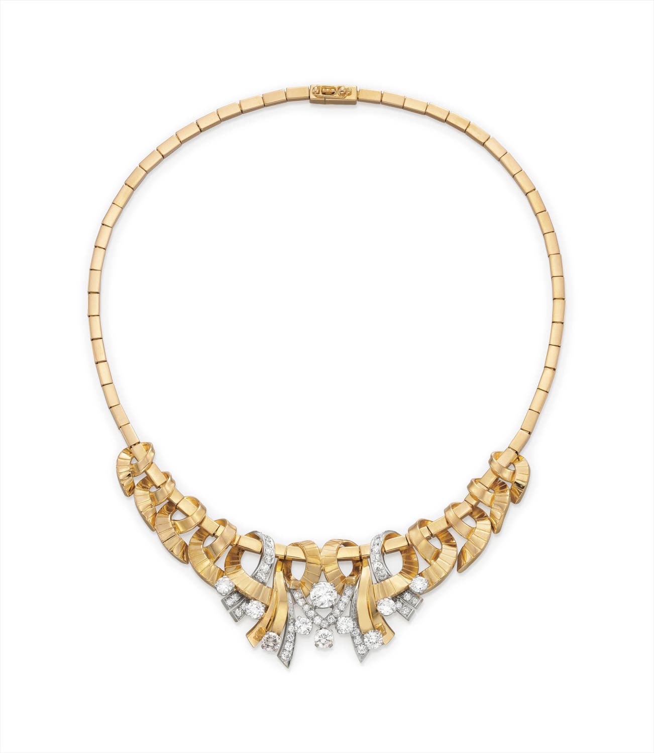 The front designed as scrolling stylized polished gold ribbon enhanced by circular-cut diamonds, extending to the rectangular-link back chain, mounted in 18K rose gold, length 15 inches.