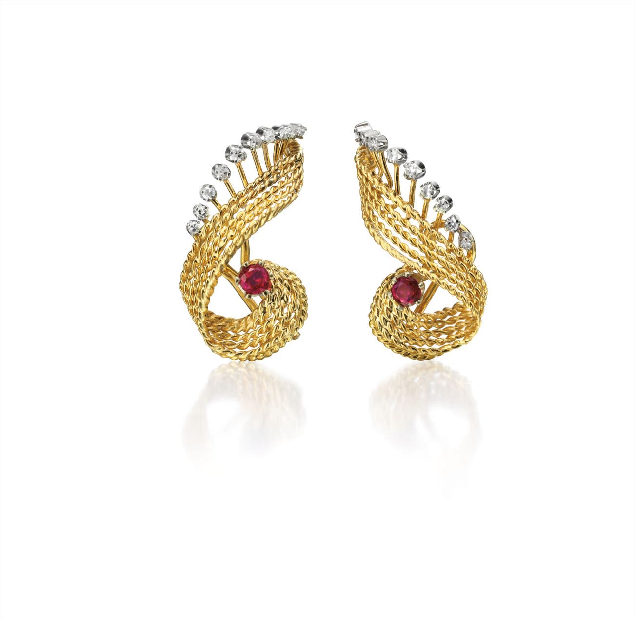 Each designed as an undulating line of polished gold rope-twists, enhanced by a circular-cut ruby and framed by collet-set diamonds, mounted in 18K yellow and white gold, length 1 1/2 inches.