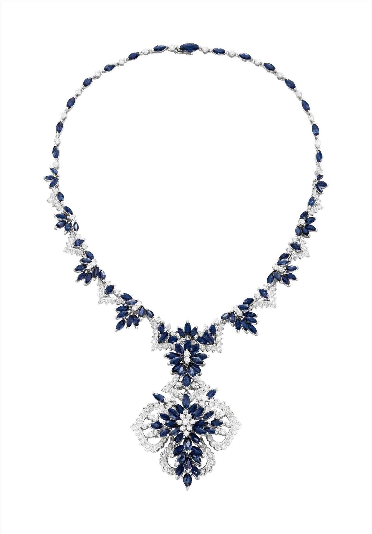 Suspending an articulated open-work plaque set with marquise-cut sapphires and circular-cut diamonds, from a similarly designed back chain, mounted in 18K white gold, chain length 15 1/2 inches, pendant length 2 1/2 inches.