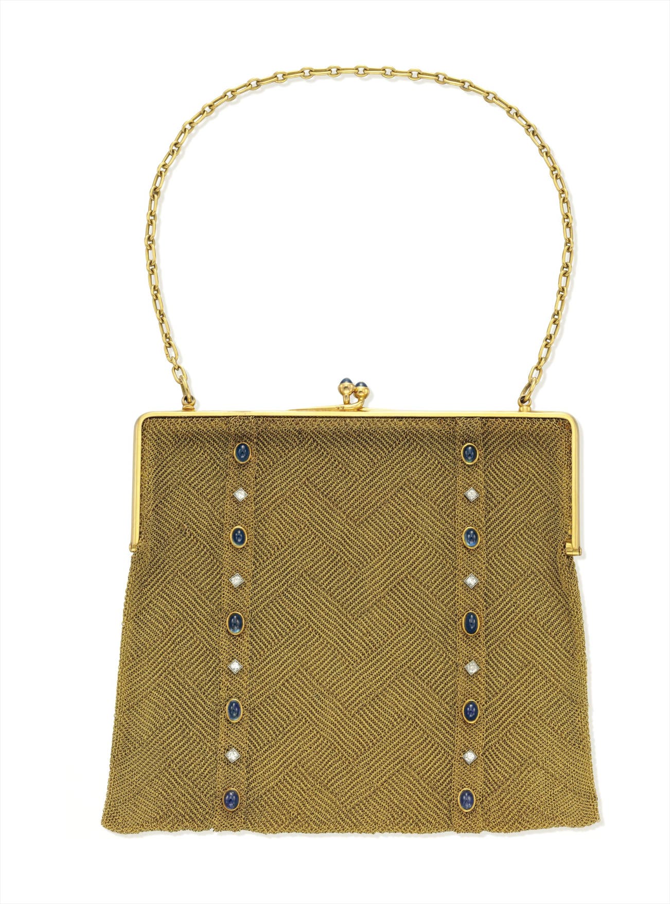 Designed as a gold mesh evening bag accented by cabochon sapphires and circular-cut diamonds, the polished gold frame enhanced by a cabochon sapphire clasp, to the gold link strap, mounted in 18K yellow gold, dimensions 5 3/8 by 5 1/2 inches.