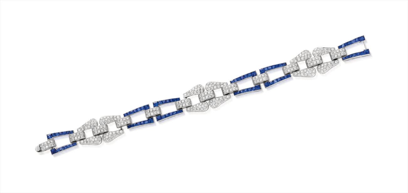 Designed as a series of geometric plaques set with circular-cut diamonds and calibré-cut sapphires, mounted in 18K white gold, length 7 3/4 inches.