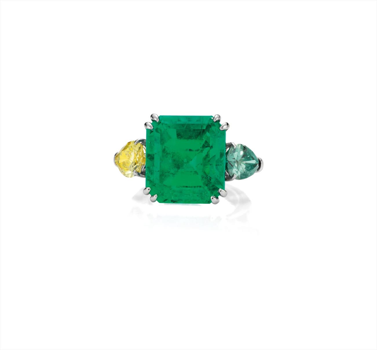 Centering upon a square-cut emerald weighing approximately 15.35 carats, flanked by a pear-shape yellow diamond and green diamond, mounted in platinum, size 7 1/4.