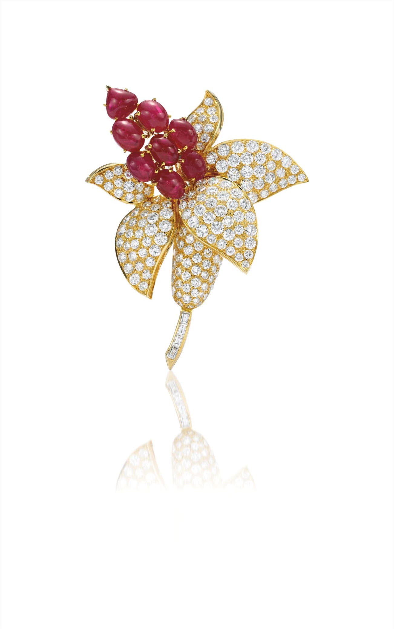 Designed as a flower entirely set with circular-cut and baguette diamonds, extending an articulated stamen set with cabochon rubies, mounted in 18K yellow gold, length 2 3/4 inches.