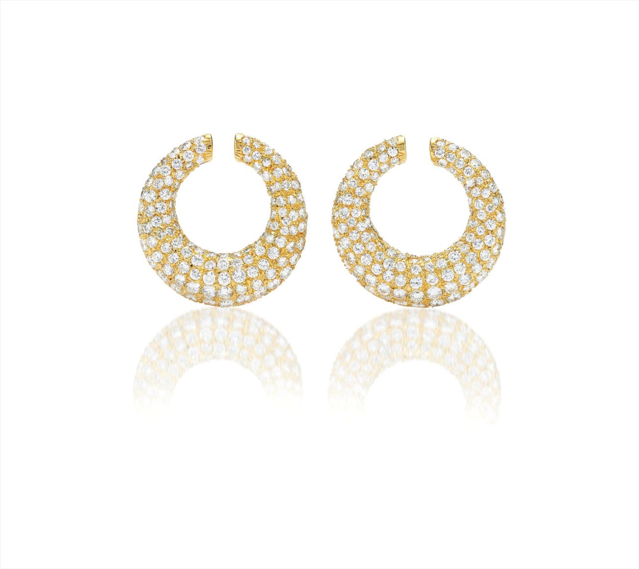 Each designed as a graduated bombé hoop enhanced by pavé-set diamonds, mounted in 18K yellow gold, length 1 inch.