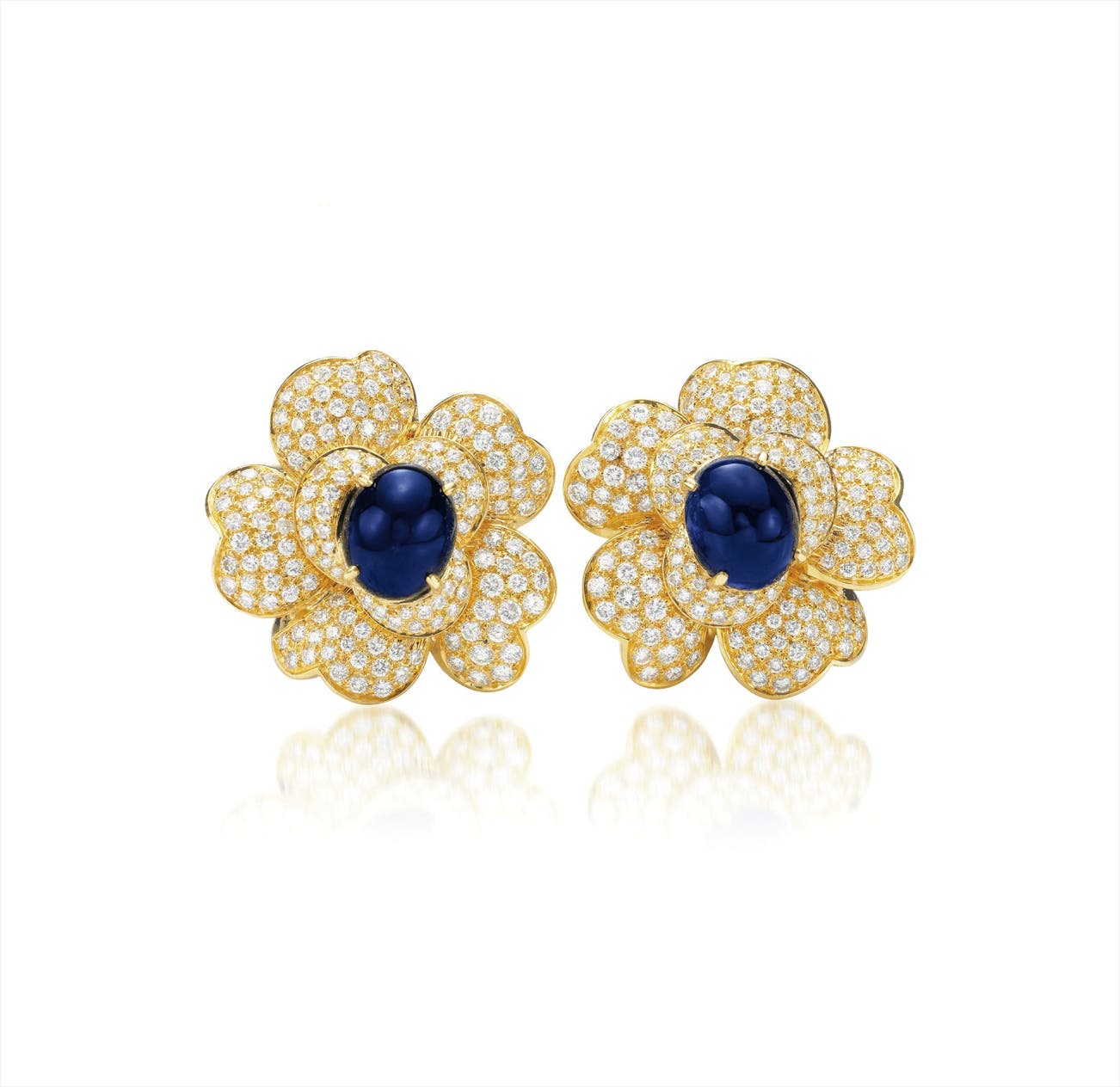 Each designed as a flower, the petals enhanced by pavé-set diamonds, centering upon a cabochon sapphire, mounted in 18K yellow gold, length 1 1/2 inches.