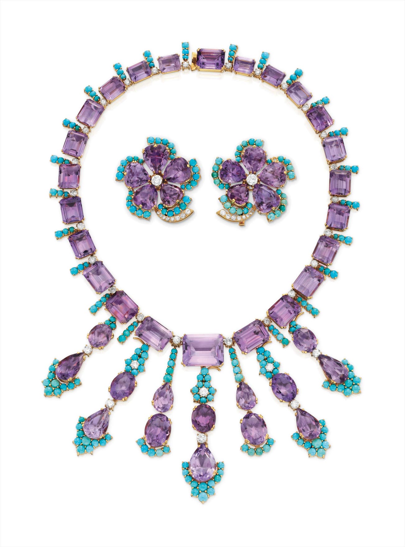 Comprising a necklace designed as a line of rectangular-cut amethysts, interspersed by cabochon turquoise and circular-cut diamonds, suspending a series of detachable fringe of similar design; a pair of brooches en suite, mounted in 18K yellow gold, necklace length 16 to 18 1/2 inches, brooch length 1 3/4 inches each.