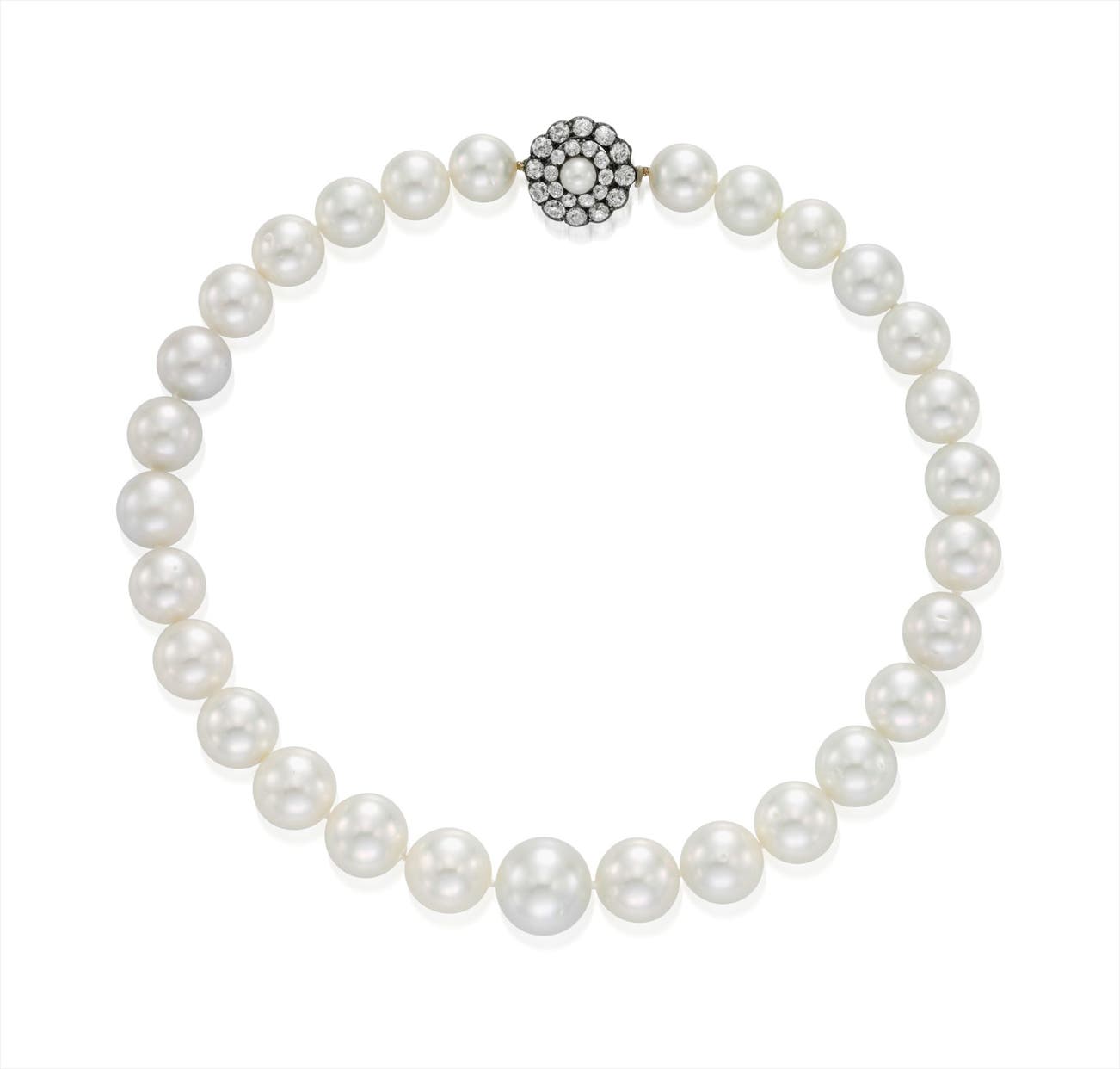 Of twenty-nine graduated South Sea cultured pearls, measuring from approximately 16.40 to 12.00 mm, joined by a clasp enhanced by old-cut diamonds and a cultured pearl, mounted in silver-topped gold, length 17 inches.