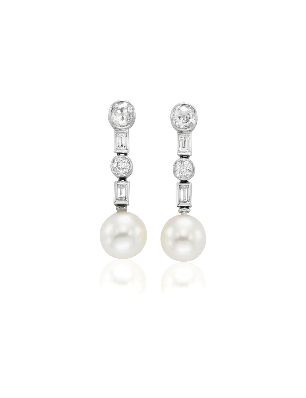 Each suspending a cultured pearl measuring approximately 9mm, from a line of collet-set baguette and circular-cut diamonds, mounted in platinum, length 1 1/4 inches.