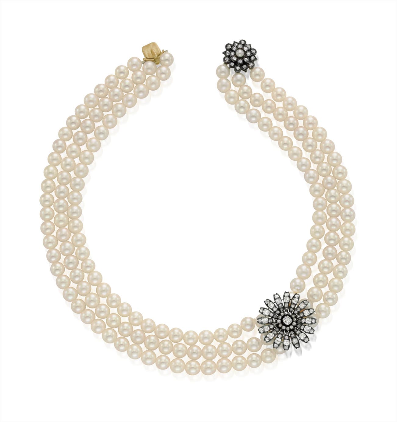 Designed as three strands of graduated cultured pearls, joined at the side by a flower accent entirely set with old-cut diamonds, to the similarly designed clasp, mounted in silver-topped gold, length 16 to 17 inches.
