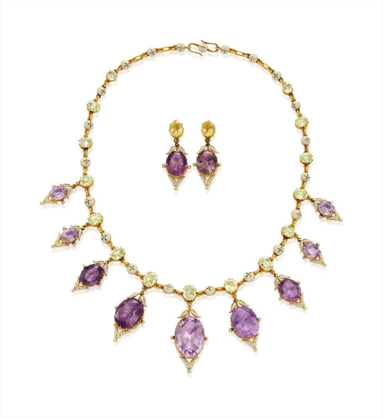 Comprising a necklace designed as a line of oval-cut chrysoberyl, interspersed by bombé plaques enhanced by cream and black enamel, the front suspending graduated amethyst fringe accented by similar enamel work; a pair of ear pendants en suite, set with heliodor surmounts and an amethyst and enamel drop, mounted in 14K yellow gold, necklace circa 1890, length 15 inches, ear pendants adapted, later fittings, length 1 1/2 inches.