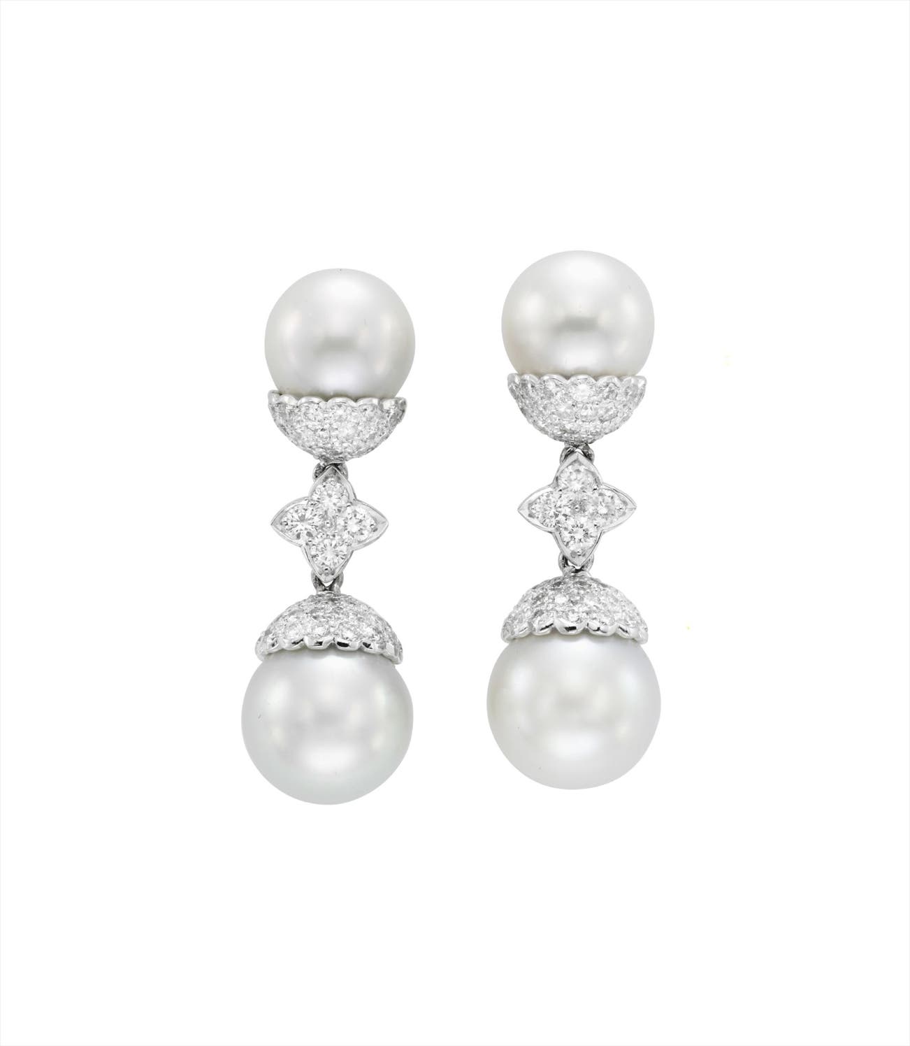 Each suspending a South Sea cultured pearl measuring approximately 14.00 mm, enhanced by a pavé-set diamond cap, to the circular-cut diamond cluster spacer link and similarly designed surmount, mounted in 18K white gold, length 1 3/4 inches.