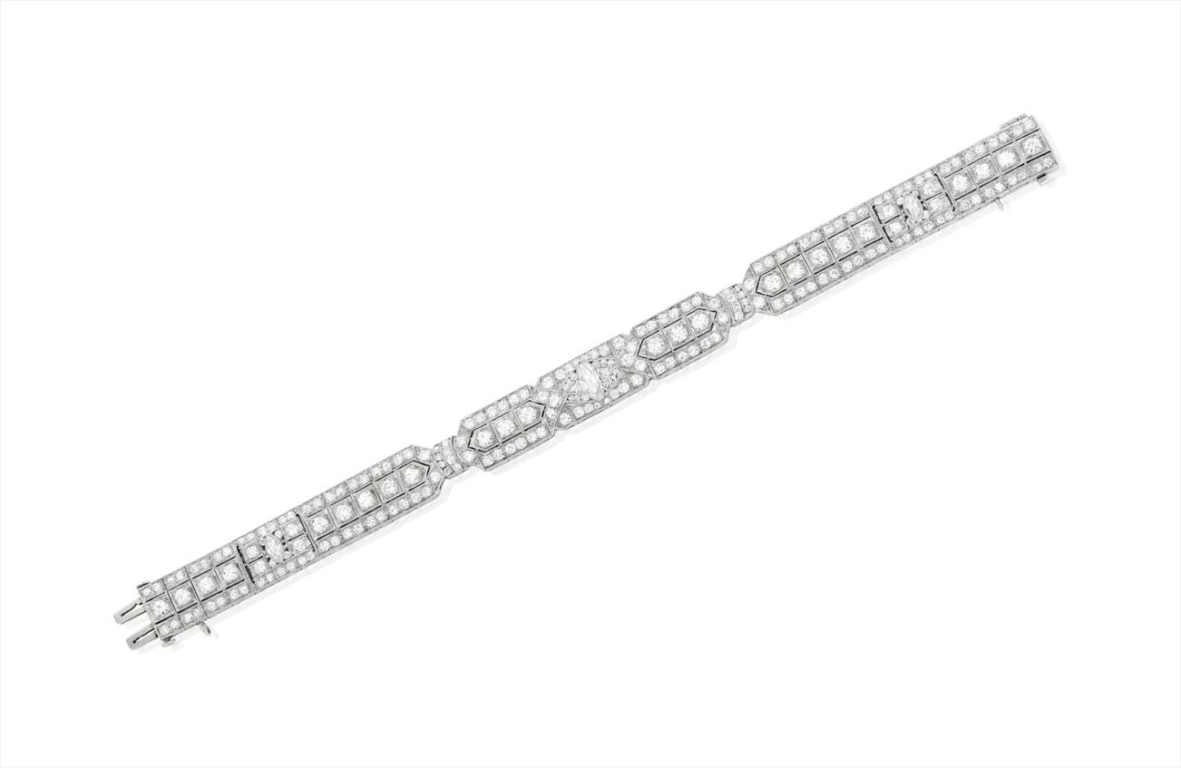 Designed as a series of geometric links set with circular-cut diamonds, each plaque centrally enhanced by three marquise diamonds, the center marquise flanked by trillion-cut diamonds, mounted in platinum, length 7 inches.