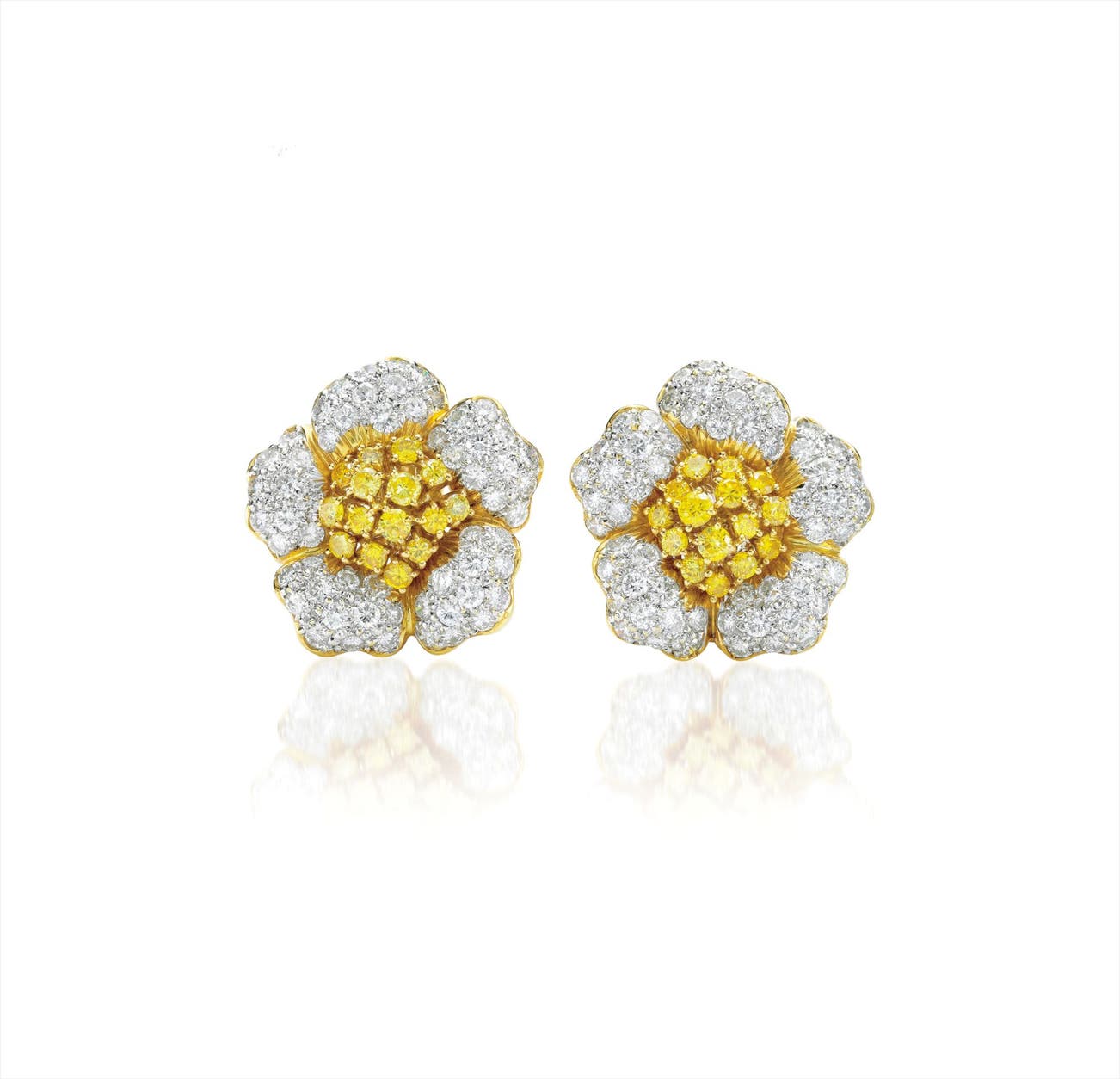 Each designed as a flower, centrally set with circular-cut yellow diamonds, the petals enhanced by pavé set diamonds, mounted in 18K yellow gold, length 1 inch.