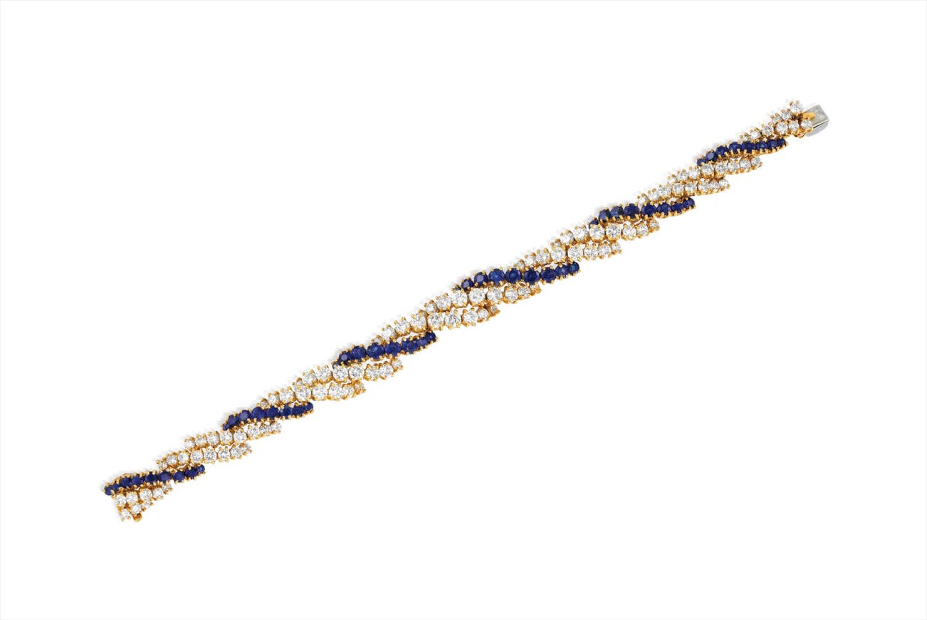 Designed as a series of contoured lines set with circular-cut sapphires and diamonds, mounted in 18K yellow gold, length 6 1/2 inches.
