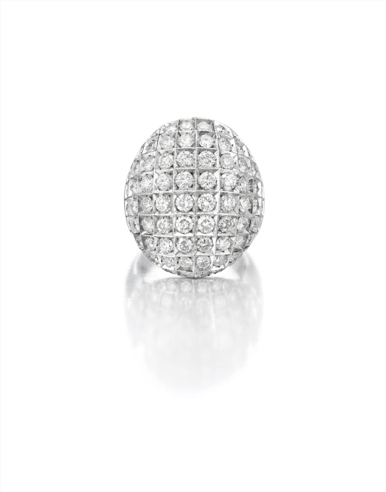 Of bombé design, the checkerboard top entirely set with circular-cut diamonds to the polished gold hoop, mounted in 18K white gold, size 8.