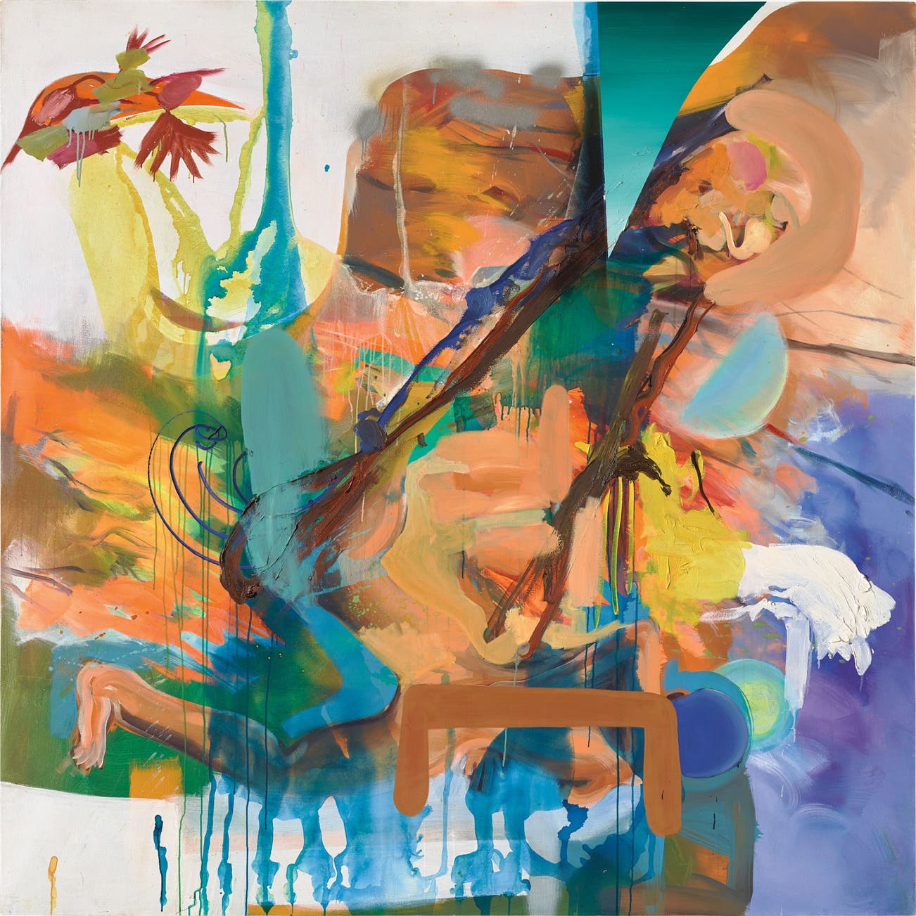 Seen in tandem with other works created in the early 2000s, such as the seminal Selbstporträt mit Offenem Mund, 2001, La Playa Nueva points to Oehlen’s simultaneous pursuit of abstract and figurative painting. As Oehlen has notably explained in this regard,‘The question “abstract or not abstract”…is irrelevant to me. I have a whole series of forerunners in this opinion, for example Georg Baselitz, who turned the motif upside-down – a magnificent gesture, considered and courageous … Upside-down, the subject is still recognizable, but it doesn’t make sense, because it’s standing on its head’ (Albert Oehlen, quoted in ‘The Rules of the Game’, Artforum, November 1994). With La Playa Nueva, Oehlen appears to be pursuing a similar strategy of turning the motif on its end. The orange silhouette of a human figure at the bottom of the canvas hints at a landscape scene having been turned 90 degrees to the right. Viewed from this perspective, a beach scene begins to reveal itself – the quasi-abstract shape in the upper left begins to read as a tropical flower, while the linearity of the rivulets of blue paint indicates the horizon of an ocean. The painting’s title, which literally translates as ‘new beach’ but could also refer to an eponymous resort in the Dominican Republic, summons a tropical scene of languor that in many ways recalls Sigmar Polke’s Dschungel, 1967. By rotating the painting and complicating straightforward readings through an explosive cacophony of form and colour, Oehlen characteristically complicates any claims of representation. As such, La Playa Nueva powerfully underlines curator Martin Clark’s acute observation that, ‘Oehlen has painted himself into a position where none of his canvases can be described as either abstract or figurative … Oehlen’s sampledelic, synthesized practice extends painting’s vocabulary – its expressive, emotional range – whether intentionally or not. But it is his attitude – Punk’s lasting legacy – that ensures his work remains so restless and vital’ (Martin Clark, ‘Abstract Painting Must Die Now’ in Albert Oehlen: I Will Always Champion Good Painting, exh. cat., Whitechapel Gallery, London, 2006, p. 59).