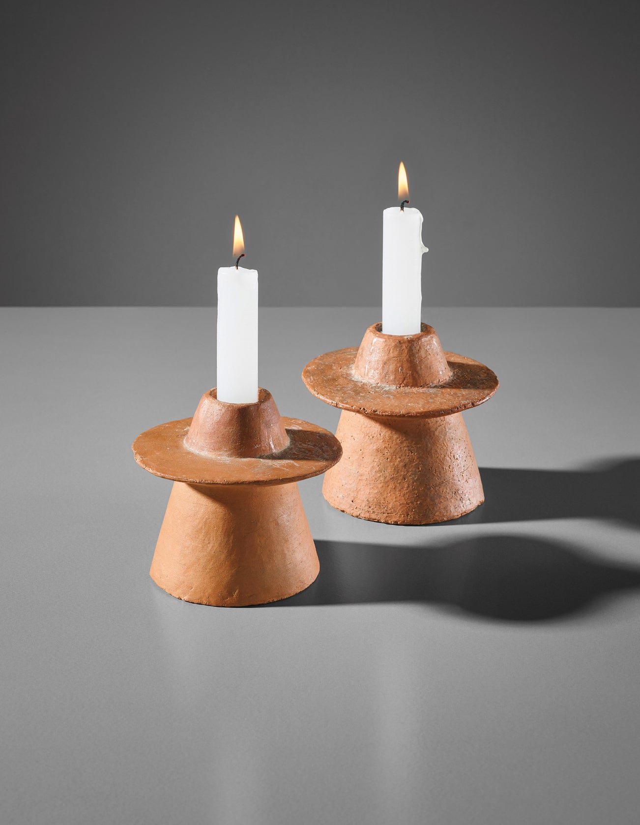 The present rare candle holder design was executed in several materials, including bronze, gilt plaster, and terracotta, in collaboration with Jean-Michel Frank. Frank is believed to have discovered Giacometti’s work at the 1929 Salon de Tuileries exposition held at the Palais de Bois. Giacometti went on to design over seventy objects for Frank, including seventeen lamps, eleven floor lamps, thirteen vases, ten wall lights, and other small accessories. Among the more notable Frank interiors to include Giacometti designs were Elsa Schiaparelli’s showroom on Place Vendôme—she in fact kept two of the present candle holders, executed in white plaster, on her desk (1934); Jean-Pierre Guerlain’s apartment (1935) and Jorge Born’s villa, Buenos Aires (1939). Giacometti assigned equal importance to his decorative works and sculptures. As he explained in a 1962 interview with André Parinaud, “For my livelihood, I accepted to make anonymous utilitarian objects for a decorator at that time, Jean-Michel Frank. […] it was mostly not well seen. It was considered a kind of decline. I nevertheless tried to make the best possible vases, for example, and I realized I was developing a vase exactly as I would a sculpture and that there was no difference between what I called a sculpture and what was an object, a vase!"