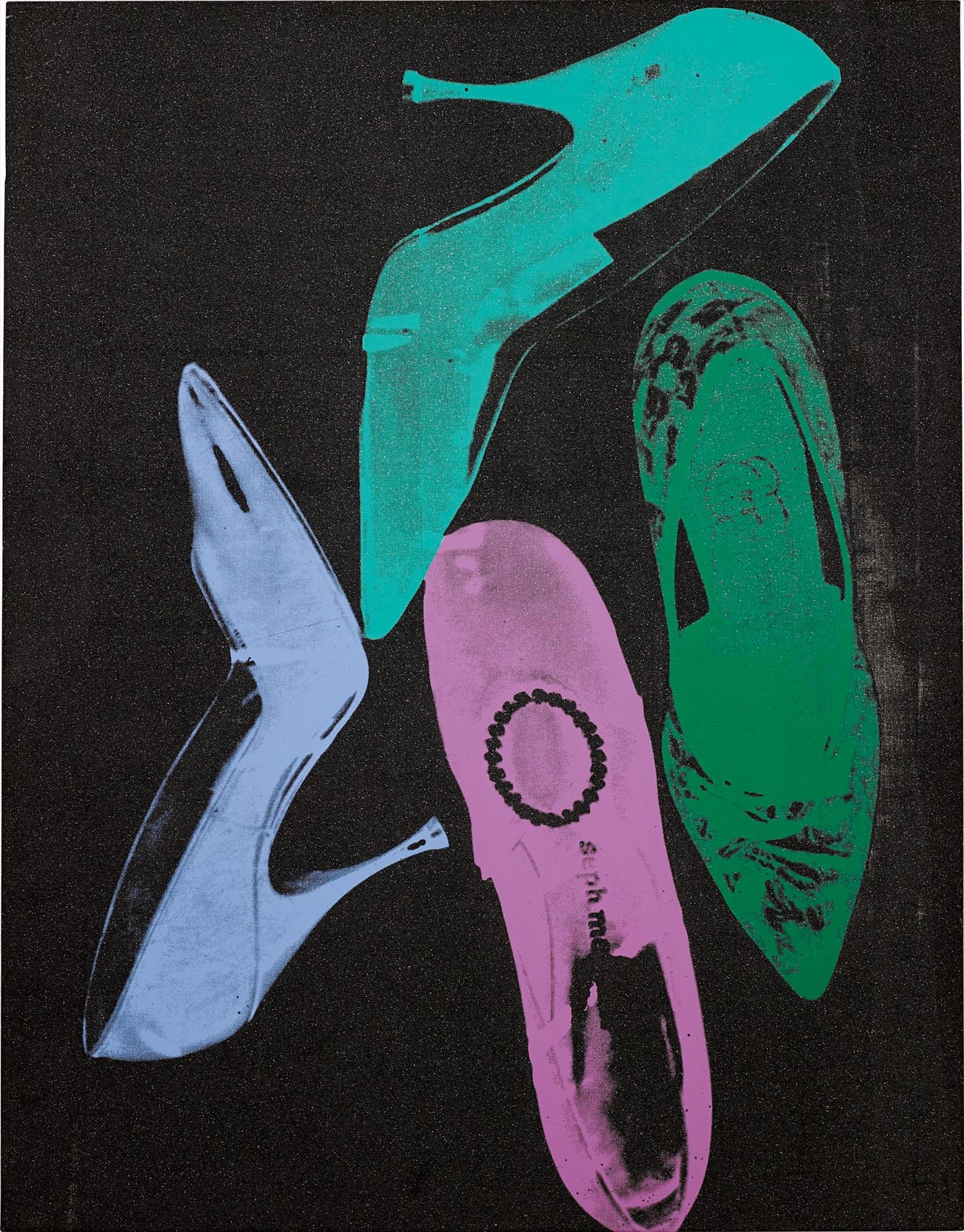 In the final decade of his life, Warhol returned to the subject of the shoe with the Diamond Dust Shoes series, based upon a group of photographs done early in Warhol’s career. In the 1950s, Halston sent Warhol a box of shoes to be photographed for an advertisement campaign. Warhol’s assistant Ronnie Cutrone emptied the box upside down, sending shoes cascading out onto the floor. Warhol, inspired by the haphazard layering of individual shoes, took several Polaroid photographs, from which silkscreens for Diamond Dust Shoes were derived twenty five years later.