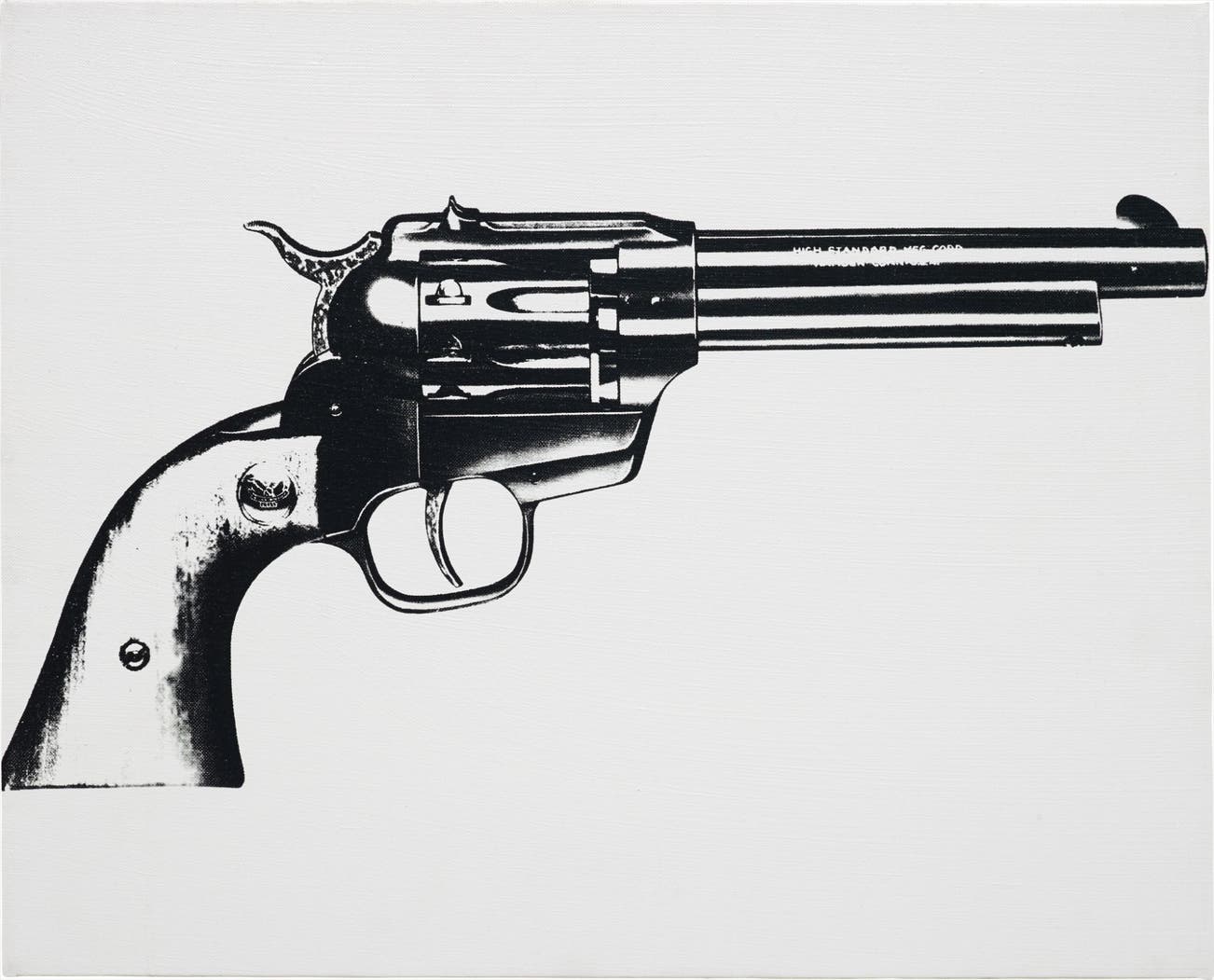 Starkly brandished against a cool, monochromatic background, the slick outline of a pistol dominates the expanse of canvas. Rather than saturating his object with the bold, tonal colours typical of some of his other works such as the Marilyn Monroe portraits, the harsh, cold edges of the gun are revealed, glinting sinisterly at the viewer. Seemingly devoid of emotion, the inherent phallocratic nature of the gun is suggestive of an overt declaration of power, ownership and authority – a visual symbol that naturally begets violence and machoism.