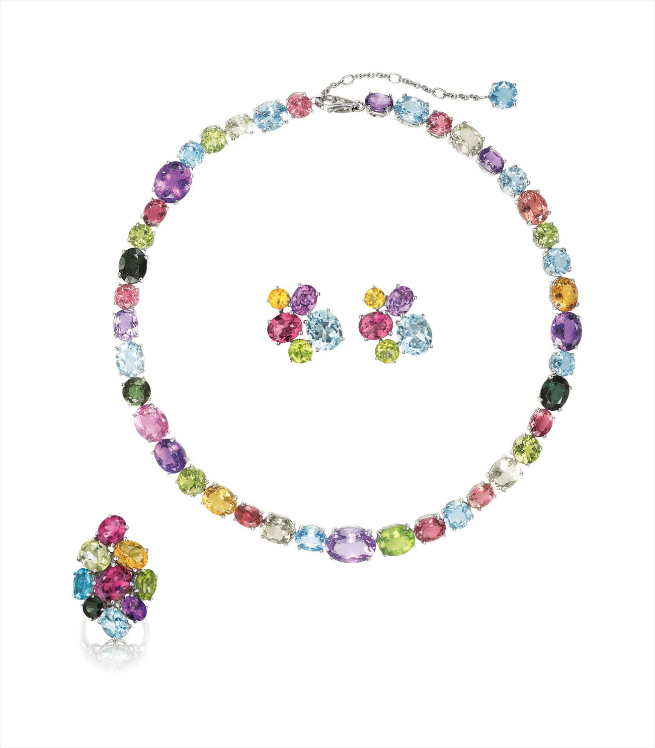 Comprising a necklace, designed as a line of oval and circular-cut amethyst, blue-topaz, peridot, citrine and tourmaline; and a pair of earclips and ring en suite, mounted in 18K white gold, necklace length 15 3/4 inches, earclips length 1 inch, ring size 7.