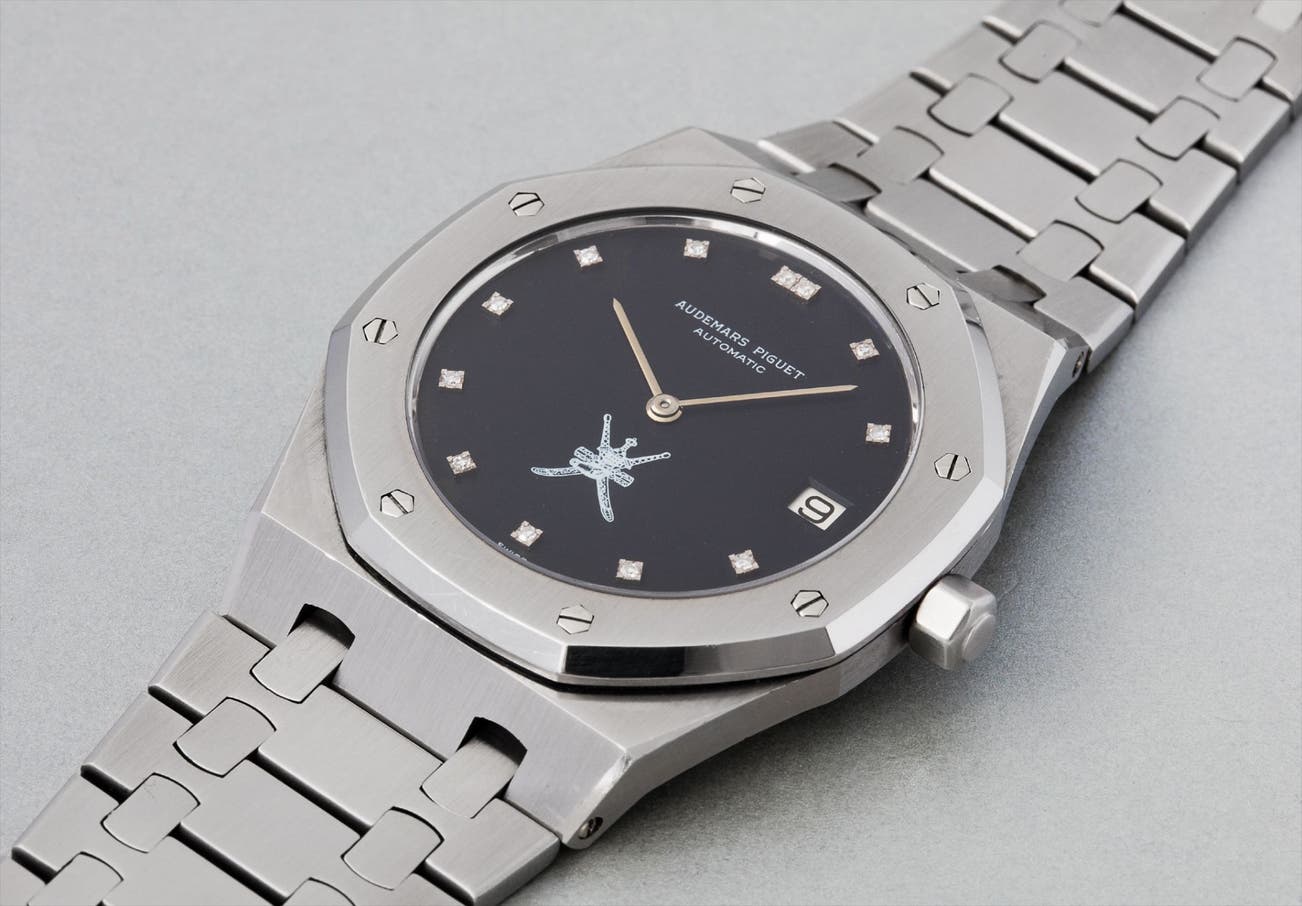 The Sultan of Oman, His Majesty Sultan Qaboos bin Said al Said, is a well-known collector and horological enthusiast, and specially commissioned watches from the finest manufactures to be given as gifts to loyal servants and foreign dignitaries. His Majesty ascended to the throne on July 23, 1970, which makes the present watch likely to be amongst the first gifts he offered during his reign. The dial is exceptional, without the characteristic “mini-tapisserie” guilloché surface found on all other A-series Royal Oaks. This flat black surface was better suited to apply the Khanjar emblem, demonstrating that this dial was custom designed for His Majesty. Furthermore, 12 round brilliant-cut diamond hour markers serve to enhance its beauty.