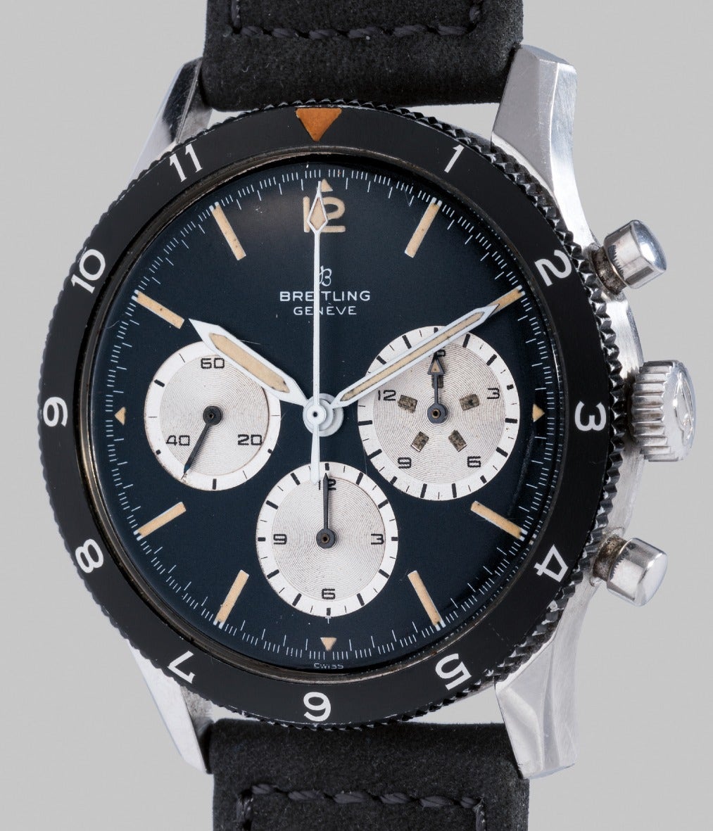 In 1953, the Breitling Watch Company launched the first reference 765 AVI: a large pilot chronograph with a 12H rotating steel bezel. The first model displayed a digital 15 minutes counter at 3 o’clock and was referred to as the 765 Digital. This counter design was later replaced by a larger 15 minutes register with oversized luminous markers placed at 3 minute increments.