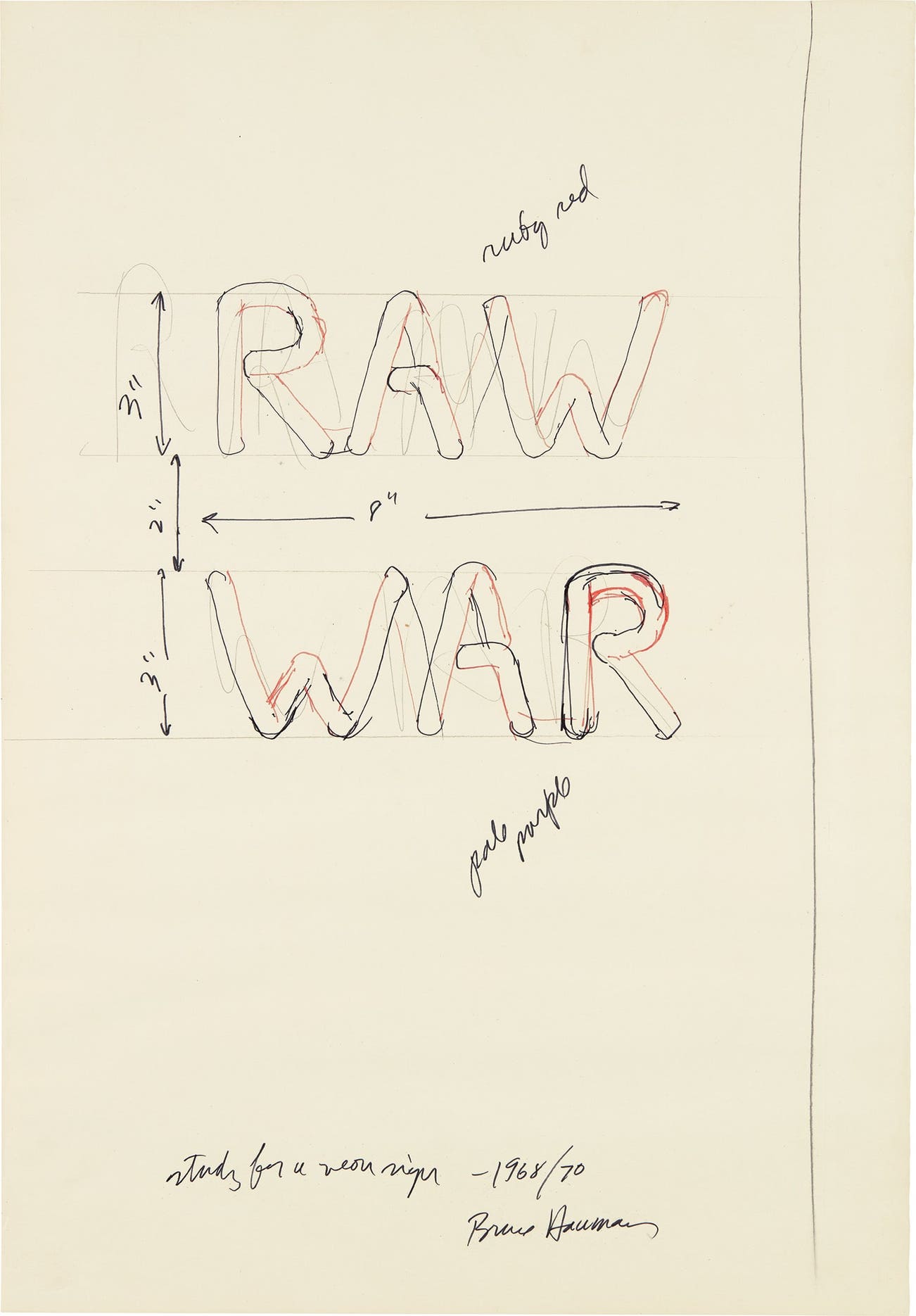 Indeed, Nauman has relied on the medium of drawing throughout his entire career, providing the foundation for his most complex works. He often goes back and forth between preparatory diagrams to finished blueprint-like drawings. As he has stated, “Yes, I work in that way a lot, where there are drawings, and then the work, and then more drawings to figure out what I’ve done, to help me resolve what I’m in as opposed to what I thought I was doing when I got started” (Bruce Nauman, quoted in “Ingrid Schaffner, Circling Oblivion/Bruce Nauman through Samuel Beckett”, Bruce Nauman, Baltimore, 2002, p. 164). This process is evident too in RAW/WAR, 1968-1970, one of just a few drawings related to Nauman’s 1970 neon work Raw War, housed in the permanent collection of the Baltimore Museum of Art, wherein the words “RAW” and “WAR” are flashed alternately. Atop and beneath the drawing of six neon letters, Nauman has annotated “ruby red” and “pale purple”, describing the colors used in the neon tubing. Likely made before the realization of the installed neon, this drawing, once again, provides us with an in-depth look into Nauman’s creative process. Related works on paper done after the neon illuminate his ongoing fascination with the palindromic phrase “RAW WAR”, including a 1971 lithograph housed in the permanent collection of the Tate, London.