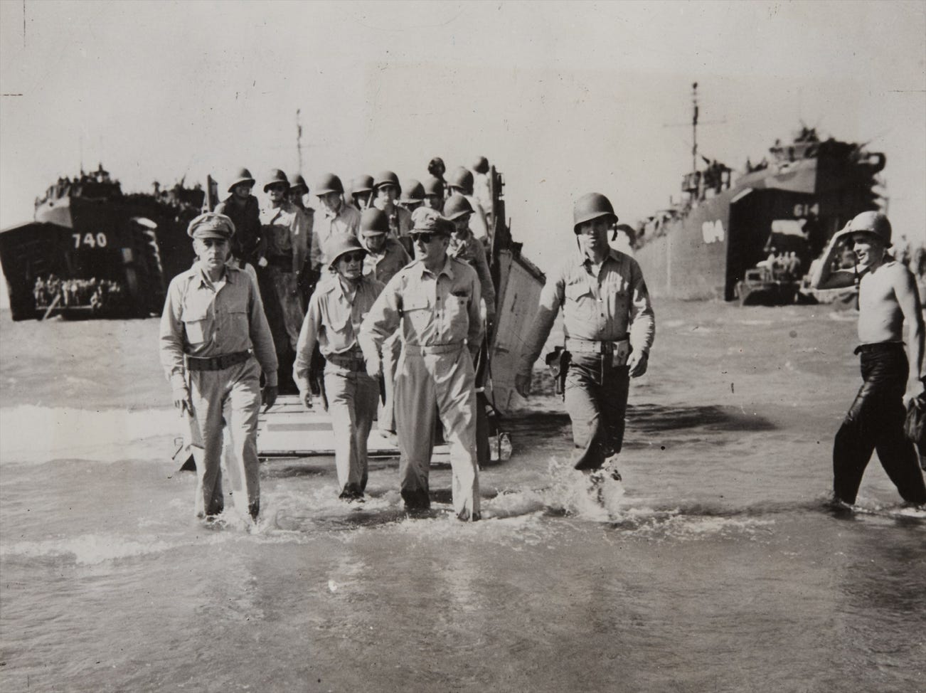 Gen. Douglas MacArthur with Gen. Richard Sutherland and Col. Lloyd Lehrbas walks through the surf to the beach at Lingayen, Luzon, the Philippines