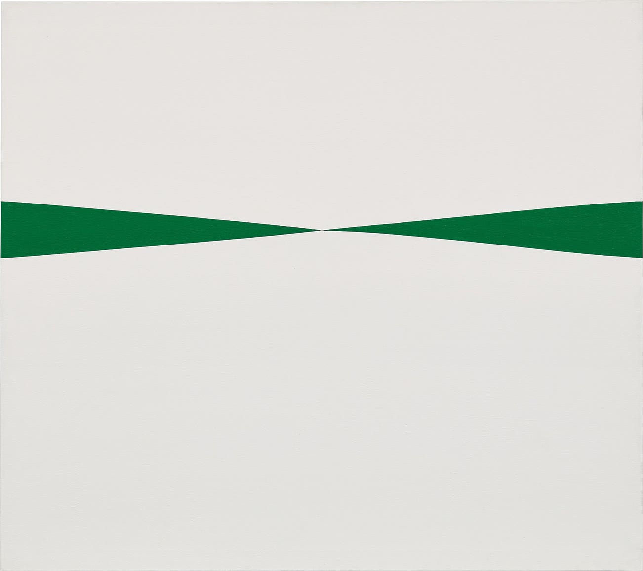 More than 50 years later this series is now widely celebrated, particularly as it relates to Herrera’s lifelong fascination with three-dimensional structures. As curator Dana Miller indeed observed, “These particular Blanco y Verde paintings unfold in the same way sculpture does when circumnavigated; they only reveal themselves when seen in person” (Dana Miller, Carmen Herrera, Lines of Sight, exh. cat., Whitney Museum of American Art, New York, 2016, p. 28). Subtle variations in the shape, scale and placement of green and white triangular forms pervade the series, with the compositions wrapping around all four edges of canvas. While demonstrating Herrera’s goal of focusing the viewer’s attention on the materiality of the painting-as-object, the triangular forms, as the artist recently allowed, also appear like cuts in the canvas – suggesting a three-dimensionality that projects outside the confines of the picture plane.