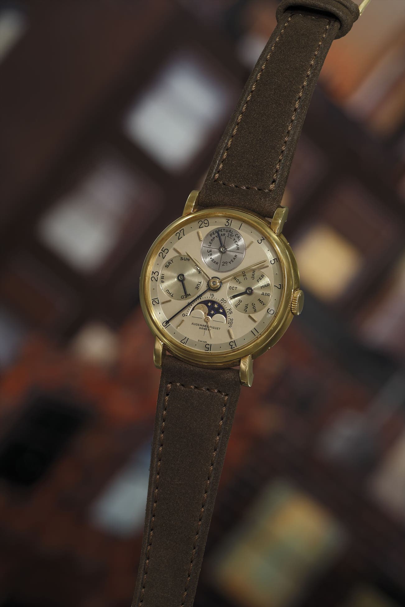 An important and extremely rare yellow gold perpetual calendar wristwatch with leap year indication, moon phase aperture, and additional dial.