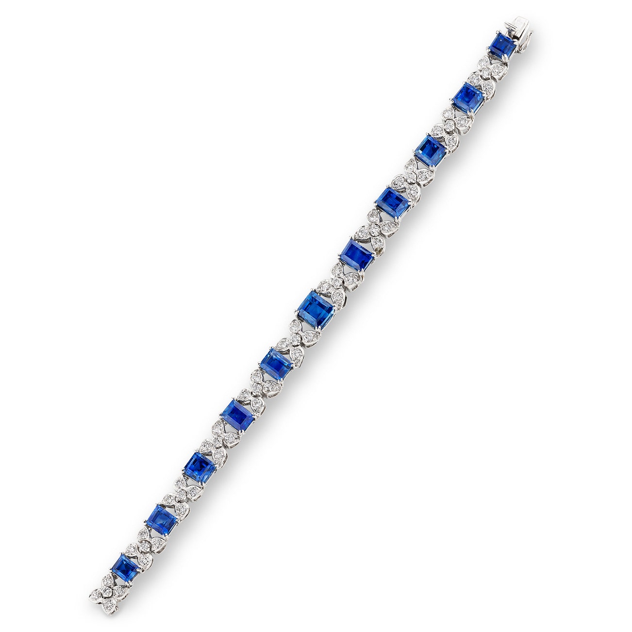 Set with step-cut sapphires weighing a total of 26.18 carats, highlighted with brilliant-cut diamonds, length approximately 175mm.