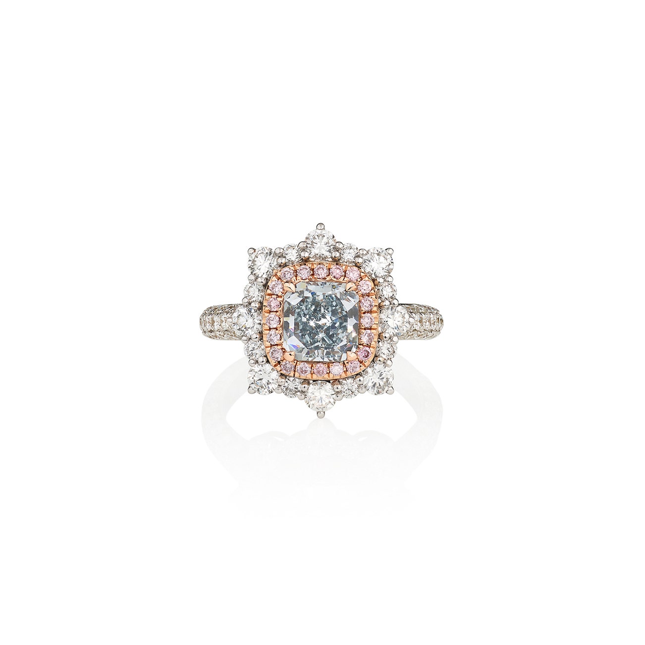 Set with a round-cornered rectangular-cut fancy intense blue diamond weighing 1.36 carats, within a frame of brilliant-cut diamonds of pink tint, highlighted with brilliant-cut diamonds, size 53.
