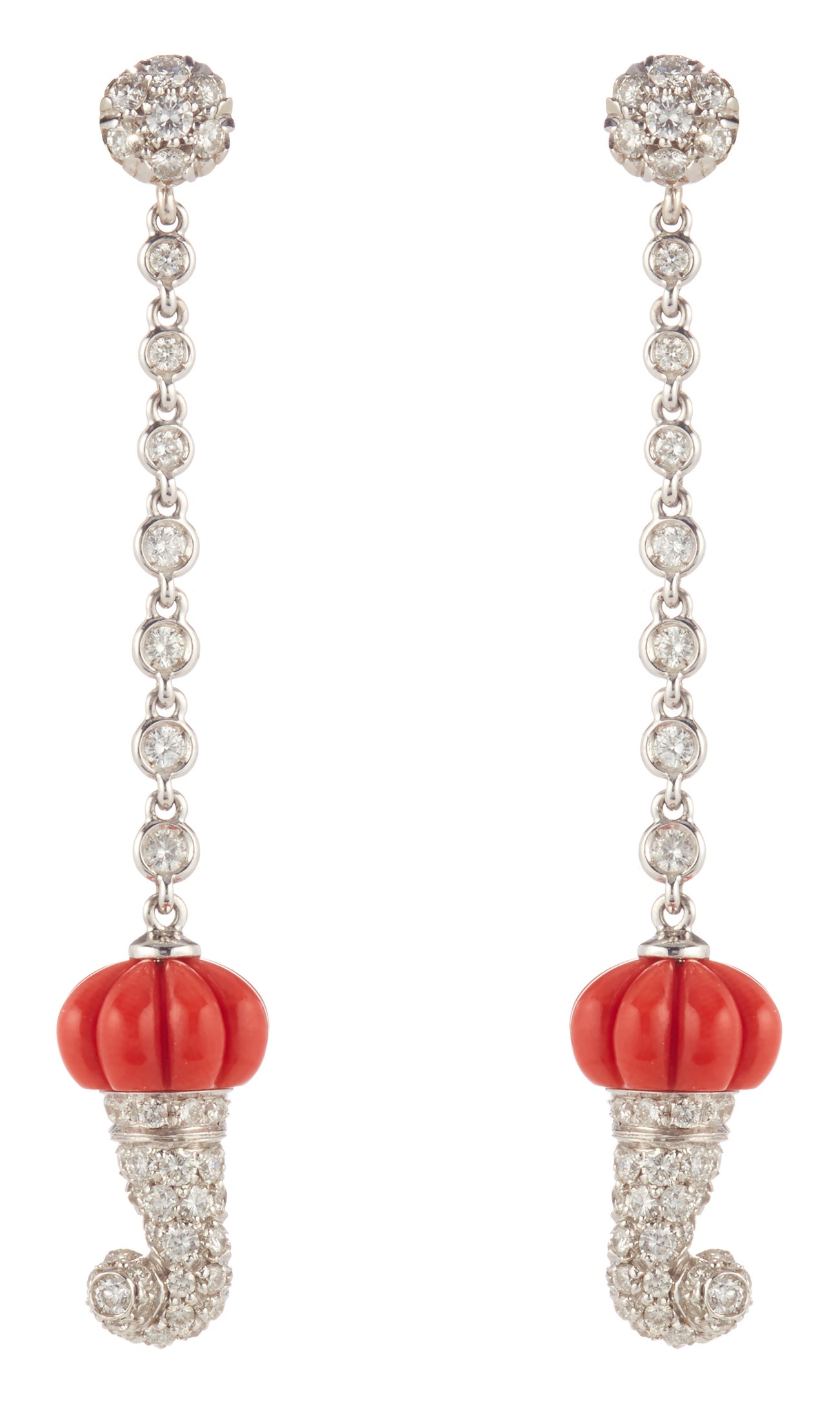 Round brilliant-cut diamonds and carved coral beads