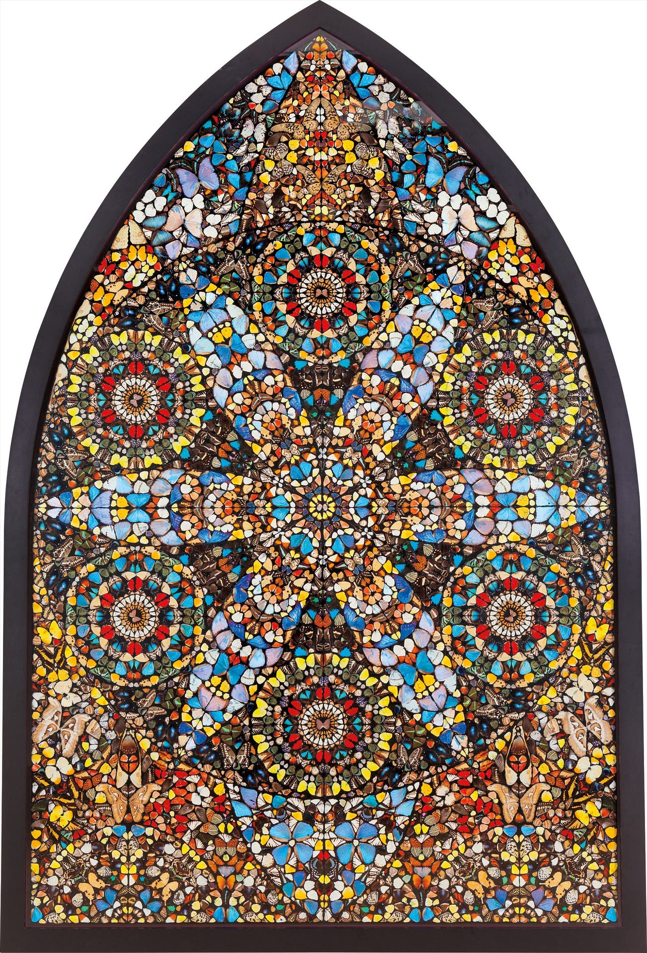 Hirst’s Kaleidoscope paintings are created by laying colorful butterfly wings into household paint and arranging them according to a very specific pattern, laid out and executed by Hirst. While the complete series is inspired by the religious iconography of stained glass, some of the pieces even reference specific, existing windows in churches throughout London. The spiritual nature of present lot and of the series is conveyed through not only the title, The Crown of Life, but also the symbolism of the butterfly. The "Crown of Life" refers directly to a line in the Bible, James 1:12 which states that those who remain steadfast under trial will be blessed to receive the crown of life promised to those who love God. This promise of life and resurrection is illustrated in the physical life of a butterfly. In antiquity, the image of the butterfly emerging form the chrysalis stood for the soul leaving the body at death. In Christian art the butterfly is a symbol of the resurrected human soul. The life-cycle of the caterpillar, chrysalis and butterfly symbolizes life, death and resurrection. As Hirst explains, “The death of an insect …. still has this really optimistic beauty,” which can be seen within the present lot. The Kaleidoscope paintings are created with only the iridescent wings of the butterfly, according to Hirst, this is done strategically to separate the dead butterflies from “the real thing.” (Damien Hirst in Damien Hirst, I Want to Spend the Rest of My Life Everywhere, with Everyone, One to One, Always, Forever, Now, 2005, p. 135) Hirst who has explained his obsession with death as “a celebration of life rather than something morbid,” strives artistically to find the beauty within the gruesome. (Damien Hirst cited in Damien Hirst and Gordon Burn, On the Way to Work, 2001, p. 21) The fragility of the natural world is clearly exposed in the present lot, laid out for the viewer to admire the permanence or hopeful non-permanence of death. The Crown of Life, 2006 beautifully conveys Hirst's obsession with color and light and the dichotomy of life and death, elegance and obscenity, immortality and extinction.