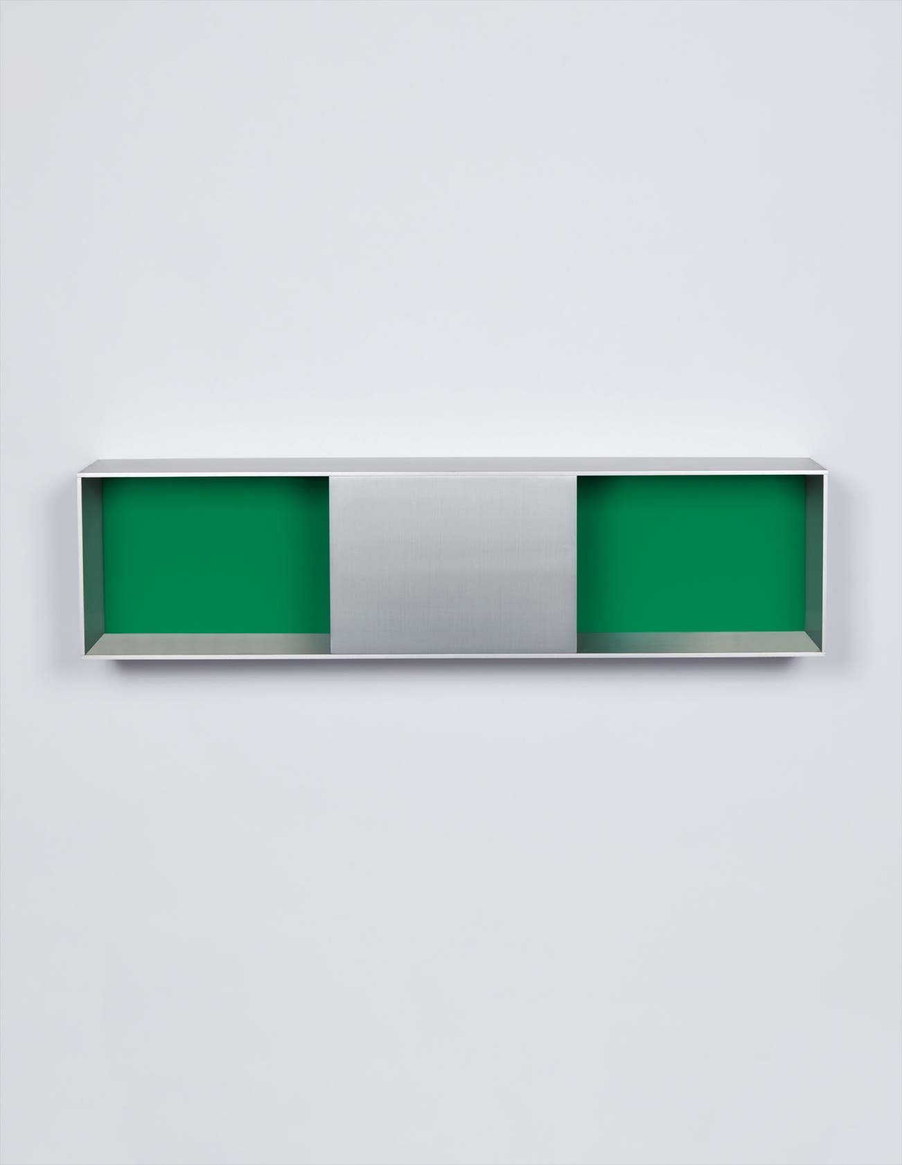 In Untitled, Judd utilizes the industrial materials of clear anodized aluminum and colored acrylic sheets to create a singular form that is without allusion to the pictorial world. The floating rectangular box, a defining characteristic of the works fabricated by Menziken, is bisected by a central panel, which divides the sculpture into three equal parts. While the viewer is initially confronted with a powerful, static form, new spatial relations come into play as his or her position shifts, reflecting the surrounding space in different iterations. In its design, Judd experiments with the striking dichotomy inherent within the structure of the Menziken-fabricated works, and also alludes to the importance of color. While the outer aluminum structure remains austere and unchanging, the interior is imbued with a richness and complexity made possible by the emerald green hue of the acrylic sheet. Floating and isolated, each of these boxes takes on a wholly distinct personality with each color variant. Ultimately, and as exemplified by the present lot, Judd’s preference for modest, simple forms allowed him to truly explore the artistic possibilities of color, light, and space for which he is renowned.