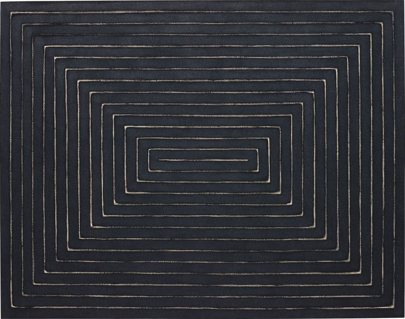 The source image for the current lot, titled Tomlinson Court Park, belongs to Frank Stella’s striking Black Paintings series. Working in the late 1950s and 1960s, Stella turned away from abstract expressionism to create reductive, non-representational paintings. In his Black Paintings, color and composition are minimized to an extreme, leaving white lines to create illusionistic, geometric effects on black canvas. The series was ultimately championed as one of the earliest forms of Minimalist Art, and in 1990 Sturtevant reproduced many of the Black Paintings for an exhibition at Rhona Hoffman Gallery in Chicago.
