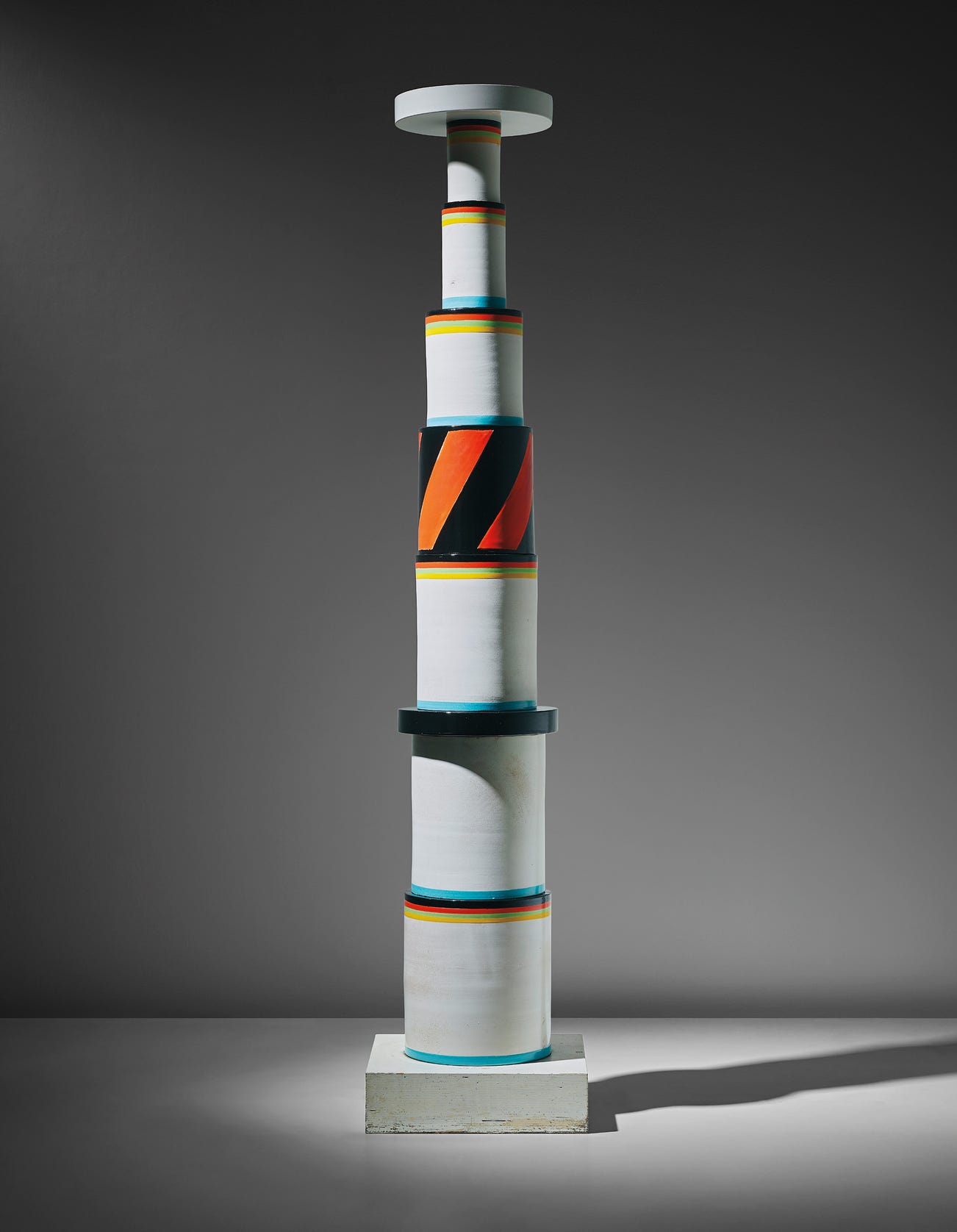 Produced by Bitossi, Montelupo Fiorentino, for the exhibition ‘Menhir, Ziggurat, Stupas, Hydrants & Gas Pumps’, April 1967, Galleria Sperone, Milan, Italy. Comprised of seven cylinders and two discs. Interior of each incised 6 I. Five cylinders with label printed, ettore sottsass 1966/ CERAMIC/PIECE/to mount from/below starting/with piece no. 1, and each signed 10/1-5 respectively. Base marked SOTTSASS 66 and label printed 18.