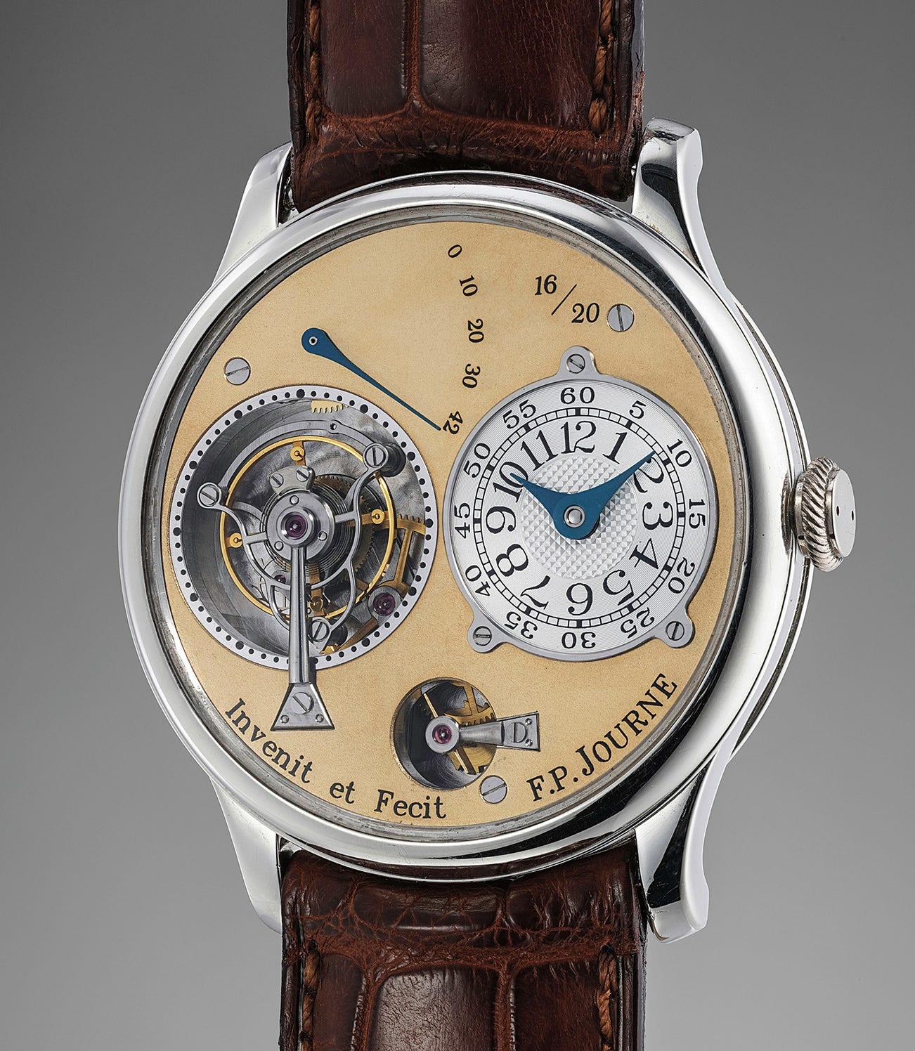 The present tourbillon bearing number 16/20 is in almost brand new unworn condition, as its owner, a friend of Journe’s, is a pocket watch collector who purchased the watch to support his friend’s new venture. He never wore it though.