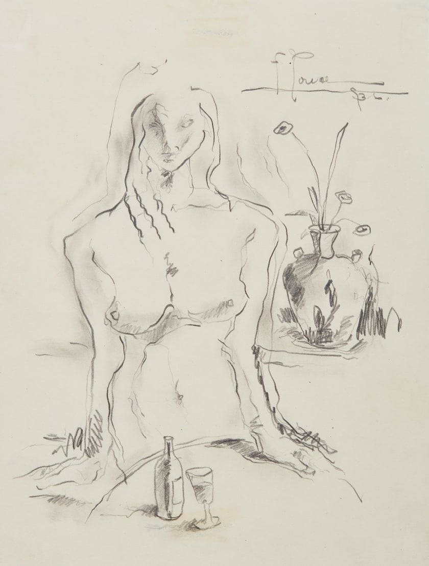 Unlike his contemporaries, Ponce de León steered away from the nationalist discourse and refrained from incorporating Cuban iconography in his work. Instead his classical, yet expressionist paintings depict more traditional and universal subject matters, such as landscapes, still lifes, biblical scenes and female nudes. Despite never having traveled to Europe, his works reference many of the great European painters such as Amadeo Modigliani, Diego Velásquez, Zurbarán, El Greco, Edward Munch and William Turner. Ponce de León’s turbulent and desperate financial situations are reflected in his tragic portrayals of poverty and illness, painted in a muted palette. The present work, La espera reveals a simple yet elegant line drawing of a somber female nude, awaiting an unforeseen event.