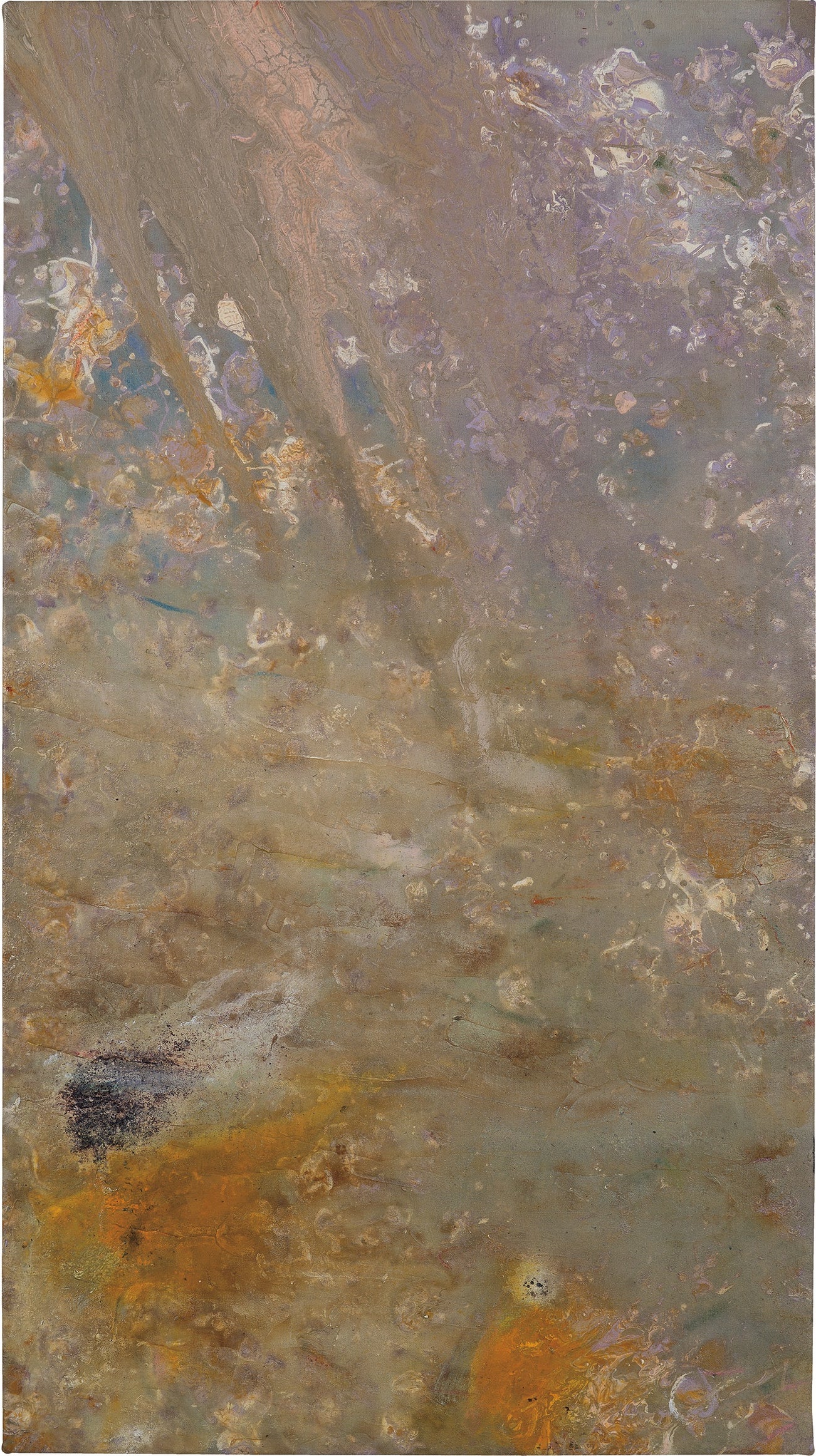 The present work, Tiger Falls, was executed in 1980, by which time Bowling had been refining his abstract painting for a decade. Bowling’s deep understanding of the motion and colour of paint is evident in this dynamic composition of violet and ochre. Warm and cool hues are blended together, calmly spilling from the top-left corner over the finely-dappled layers underneath. Unlike the hard and rigid lines of American abstraction, visible in the work of Morris Louis or Kenneth Noland, Tiger Falls is an exploration into both the formal materiality as well as atmospheric suggestiveness of paint. In unison with the title, Bowling’s application of the medium is an organic mixture of impasto and thinner painterly washes, both invoking the natural world. Retaining a captivating ambiguity, Tiger Falls transports us into the depths of nature, inviting the viewer’s eye to follow the cascades of paint in motion.