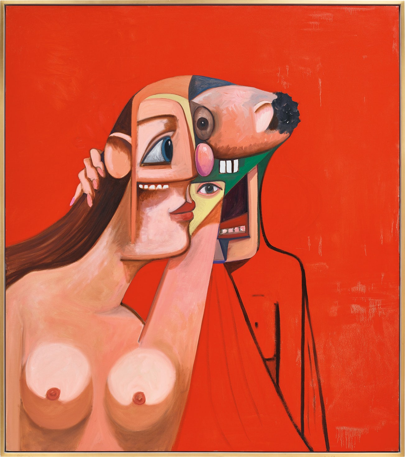 Initially working for Andy Warhol at the Factory in New York in the 1980s, Condo left to pursue his own artistic technique. Diverging from the styles employed by fellow artists, Condo was heavily influenced by Francisco Goya, Frans Hals, Willem de Kooning and Picasso: ‘There was a new wave of figurative art going on in New York then, with Basquiat, and Schnabel, and Keith Haring and a few others, but I didn’t want to be part of that. I felt I had to come back to New York with a statement that would stand up against Andy Warhol’s soup cans. And the irony was that it turned out to be Old Master painting’ (George Condo, quoted in Calvin Tomkins, ‘Portraits of Imaginary People’, The New Yorker, 17 January 2011, online). Fascinated by the emotional expressionism prevalent in Old Master painting, Condo portrays his interest in surface pattern and the play of light. Sliding between conflicting picture planes in Woman & Man, we are also dragged between the overtly sensitive and intense portraits of Goya, who had allowed fantastical creatures to pervade his compositions, introducing, like Condo, a nightmare world.