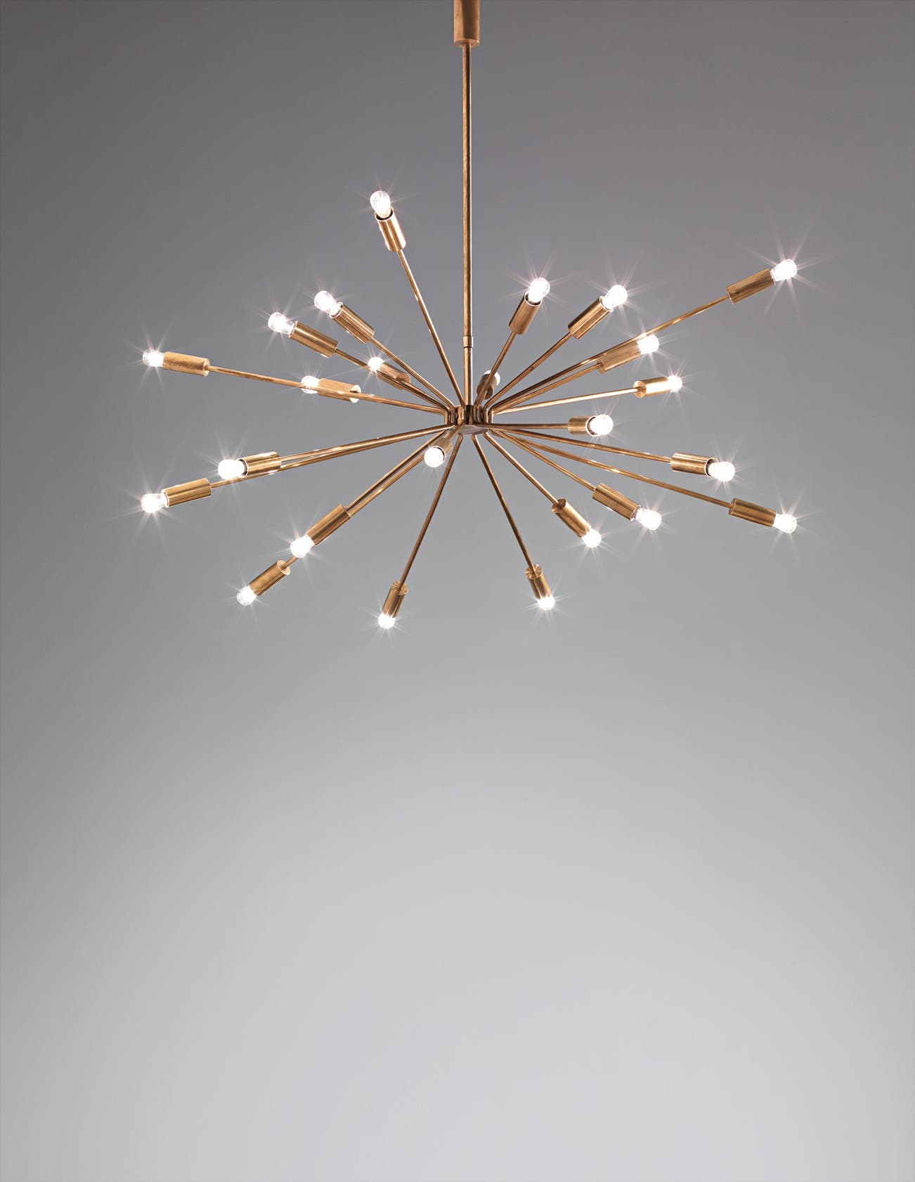 Italian | B. 1912 D. 1985Rising above the devastation of World War II, post-war Italian design reached new heights of productivity and ingenuity, particularly in the realm of lighting. Gino Sarfatti is among the most celebrated lighting designers from this fruitful period. Before founding his company Arteluce in 1939, Sarfatti studied aeronautical engineering. He brought the inventiveness of a self-taught outsider to the field of lighting design, while his mechanical background lent lightness and ingenuity of construction. Poetic underpinnings are also evident in lamps such as model no. 1034 (sometimes referred to as the "Vine" lamp), which features a nearly 8' twisting brass stem graced with nine delicate, articulating white shades like buds on a flower.