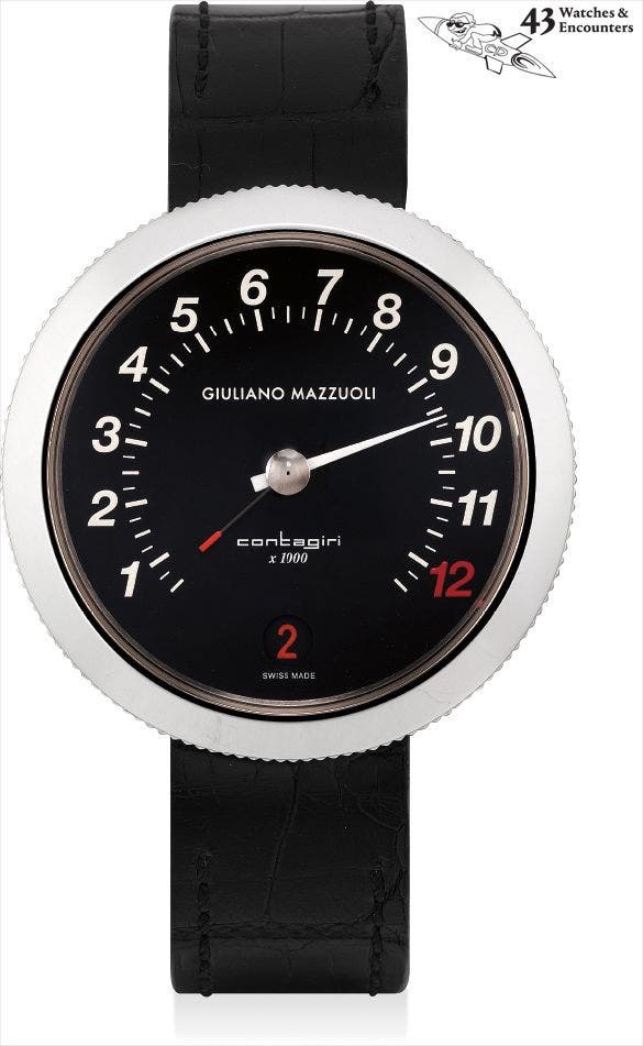 'The present Contagiri wristwatch underwent 4 years of research and development before it was introduced to the market. Much inspired from Giuliano Mazzuoli's experience as a racecar driver and his passion for the world of automobiles, the present watch features a revolutionary system to measure time. The dial, inspired from the tachymeter in a sports cars, features one hand that moves across the arc and retrograde indicating the hour. The band is fitted with a stow-away lever that acts like a gear shift and allows the user to wind the movement or set the time by turning the bezel. The small aperture at 6 o'clock marks the position of the gear with '1' indicating the position for winding the watch and '2' indicating the position for setting the time.'