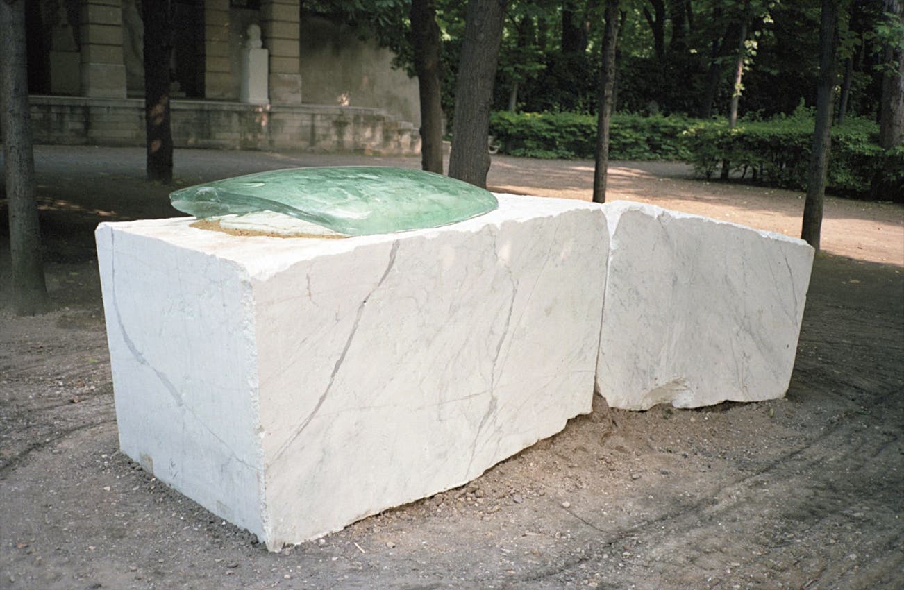 Nature forever remains the ever-changing background of human existence, Penone channels the powerful and unrelenting strength of nature in order to toy and interact with its elements. The present lot, comprised of 2 marble slabs act as the base for which a glass fingernail sits. Of the works, the artist explains that within the Fingernail and Marble (Unghia e marmo),“I began with the idea of the fingernail as a tool for making sculpture, as a utensil of the body…I thought of making the fingernails of glass because glass is used to clean wood, its sharp. At the same time it’s transparent, so the glass and fingernail would have the same identity and fragility.” (Giuseppe Penone in Celant Germano, “Intertwining Metamorphoses,” Giuseppe Penone, Milan, 1989, p. 27)