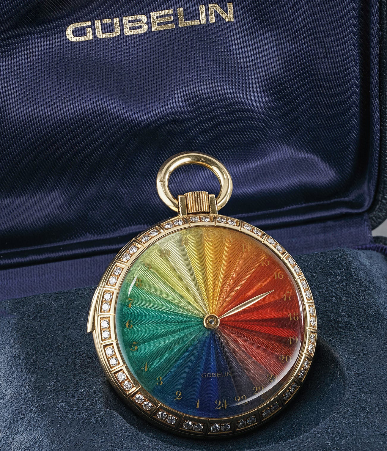 The present watch is a unique piece as confirmed by the Extract from the Archives. Indicating time via a single hand on a 24-hour basis, this feature obliges the owner to trigger the minute repeater in order to know how many minutes have elapsed. The intricate flinqué enamel dial is a work of art in its own right and a vision of beauty and grace. Each hour is represented by a specific color that gently graduates in hue to mimic the color spectrum. The tones here range from a vibrant and intense yellow, to orange and deep red that slowly morph to mauve, blue and chartreuse green and then back to yellow.