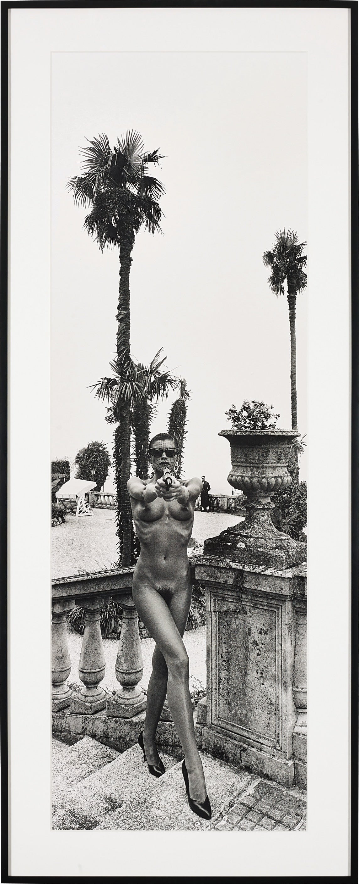 This visually arresting image was taken in 1989 during a commissioned shoot for the first calendar published by Max, the glossy Italian monthly magazine. The 1990 Max calendar, featuring 12 models photographed by Newton, included a variant image with the same nude holding the gun down for the month of March. In comparing these two versions of Panoramic Nude with Gun, the present image with the gun pointing at you can be read as the in-the-moment shot and the published image with the gun down as the moment after. The Max calendar shoot took place at the Hotel Villa d’Este on Lake Como in Italy, considered to be one of the most beautiful examples of 16th century architecture. Newton had previously photographed there in 1975 and in 1980. The exclusivity of the location surely appealed to his desire to shoot in places ‘out of bounds for photographers’ (Helmut Newton: Work, 2000).