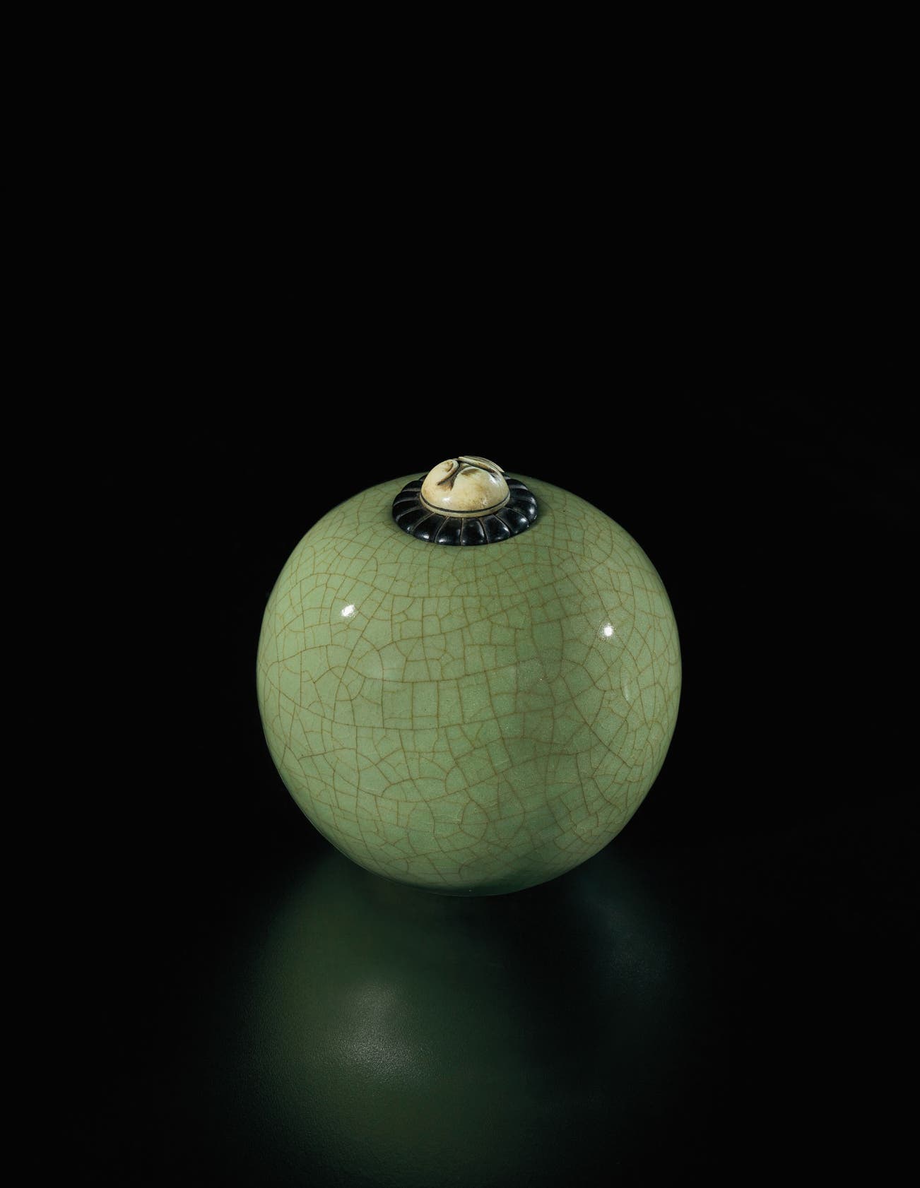 Stoneware with green crackle glaze, carved ebony and ivory stopper.